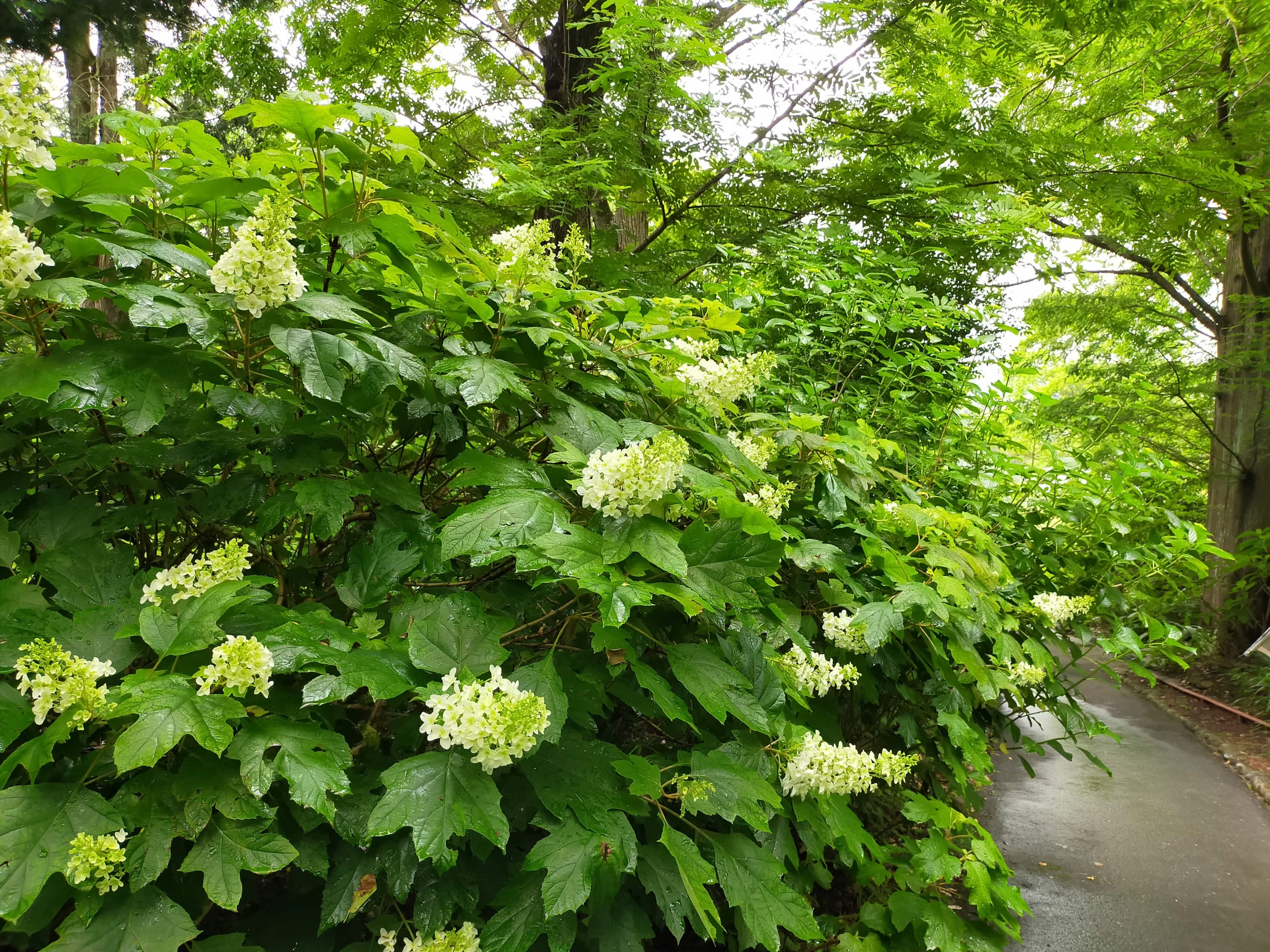 ・葉の形から名付けられたカシワバアジサイが人目を引く頃に梅雨が訪れます。