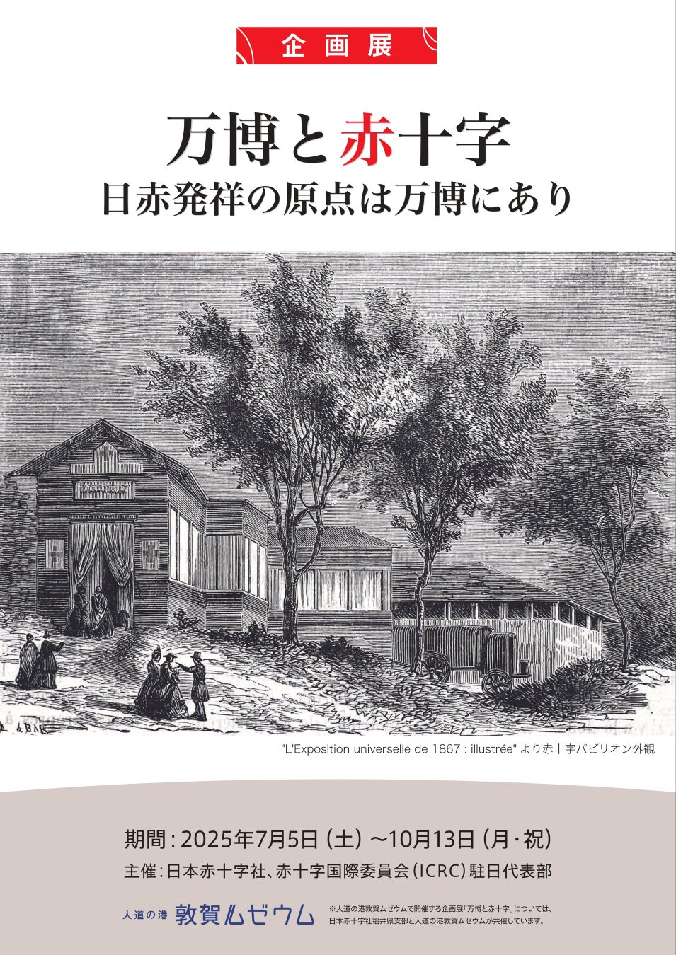 今年2025年大阪関西万博の開催を契機としまして、日本赤十字社が主催しております、同社の設立と万博の関係性について紹介する企画展「万博と赤十字」を、人道の港 敦賀ムゼウムと日本赤十字社福井県支部との共催で開催します。