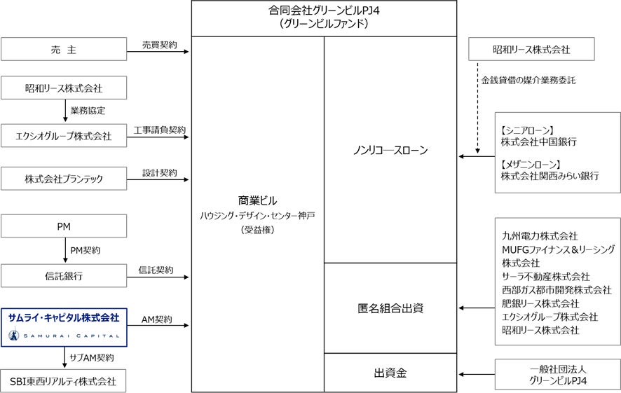 サムライ・キャピタル株式会社(東京都港区、代表取締役社長 青山 健、以下、「当社」)は、兵庫県神戸市内の既存ビル(商業施設)について、アセットマネージャーとして、SPC(合同会社グリーンビルPJ4)を通じ省エネ化工事を行い、BELS☆☆☆以上の認証を取得することを目的としたファンドの4号ファンド(以下、「本ファンド」)を組成しました。3号ファンドまでは都内のオフィスビルを対象としておりましたが、本4号ファンドにおいては、関西圏の商業ビルを対象とする新しい試みとなります。なお、1号ファンドにおきましては、全3物件のうち2物件でZEB Ready、1物件でBELS☆☆☆☆を取得しており、2号ファンドにおきましては、全5物件のうち1物件でZEB Ready、2物件でBELS☆☆☆☆、3号ファンドにおきましては、取得した物件でZEB Readyを取得する予定です。