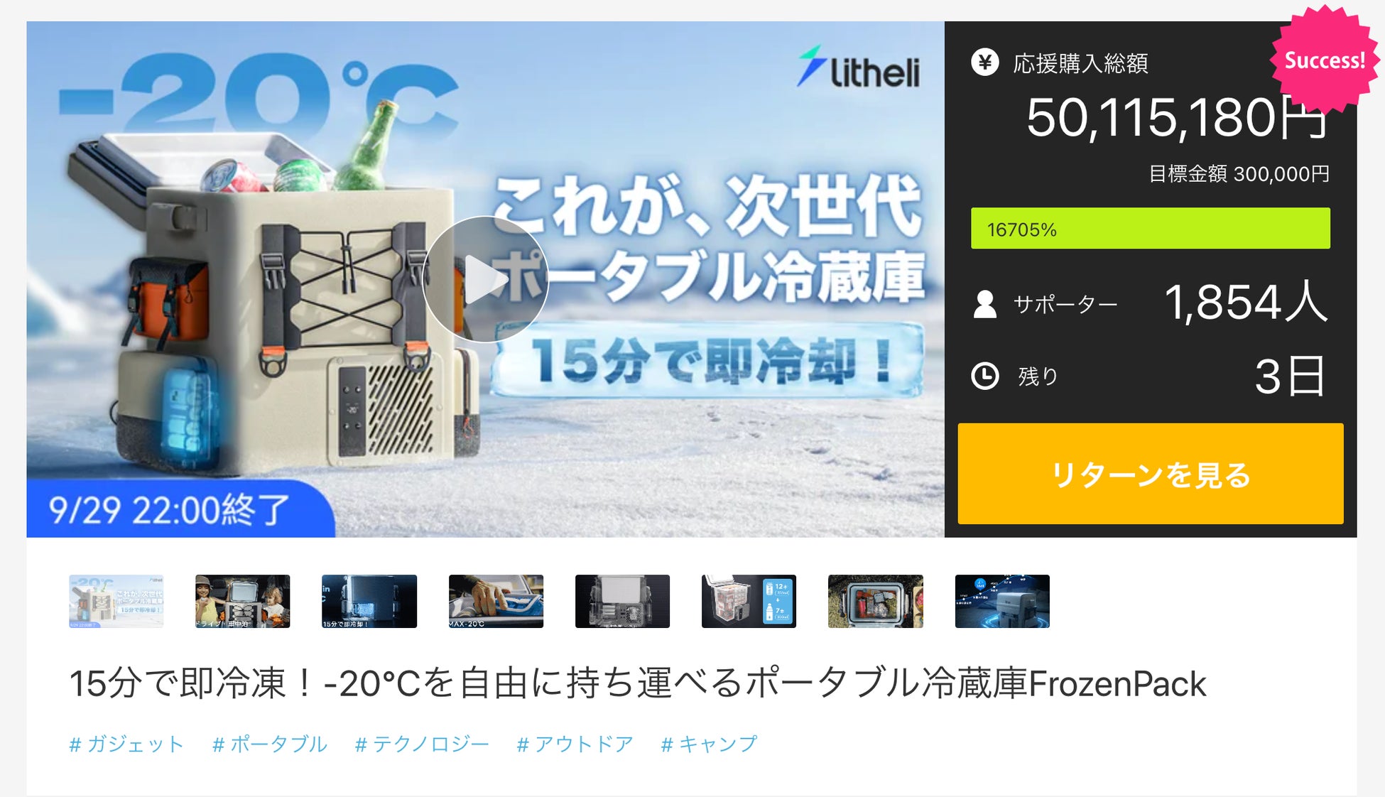 まもなく終了!ポータブル冷蔵庫「FrozenPack」がMakuakeにて5,000万円突破!