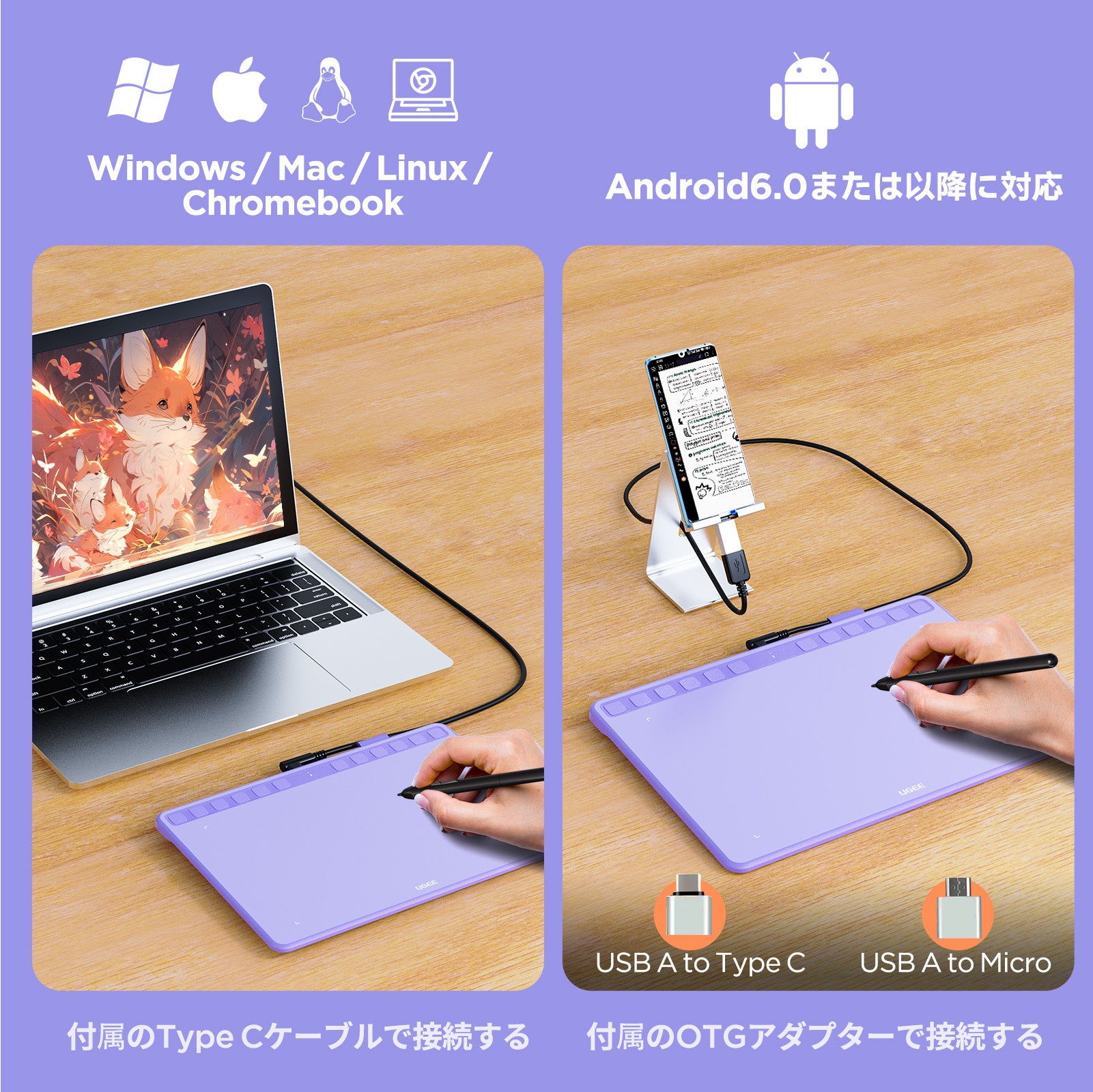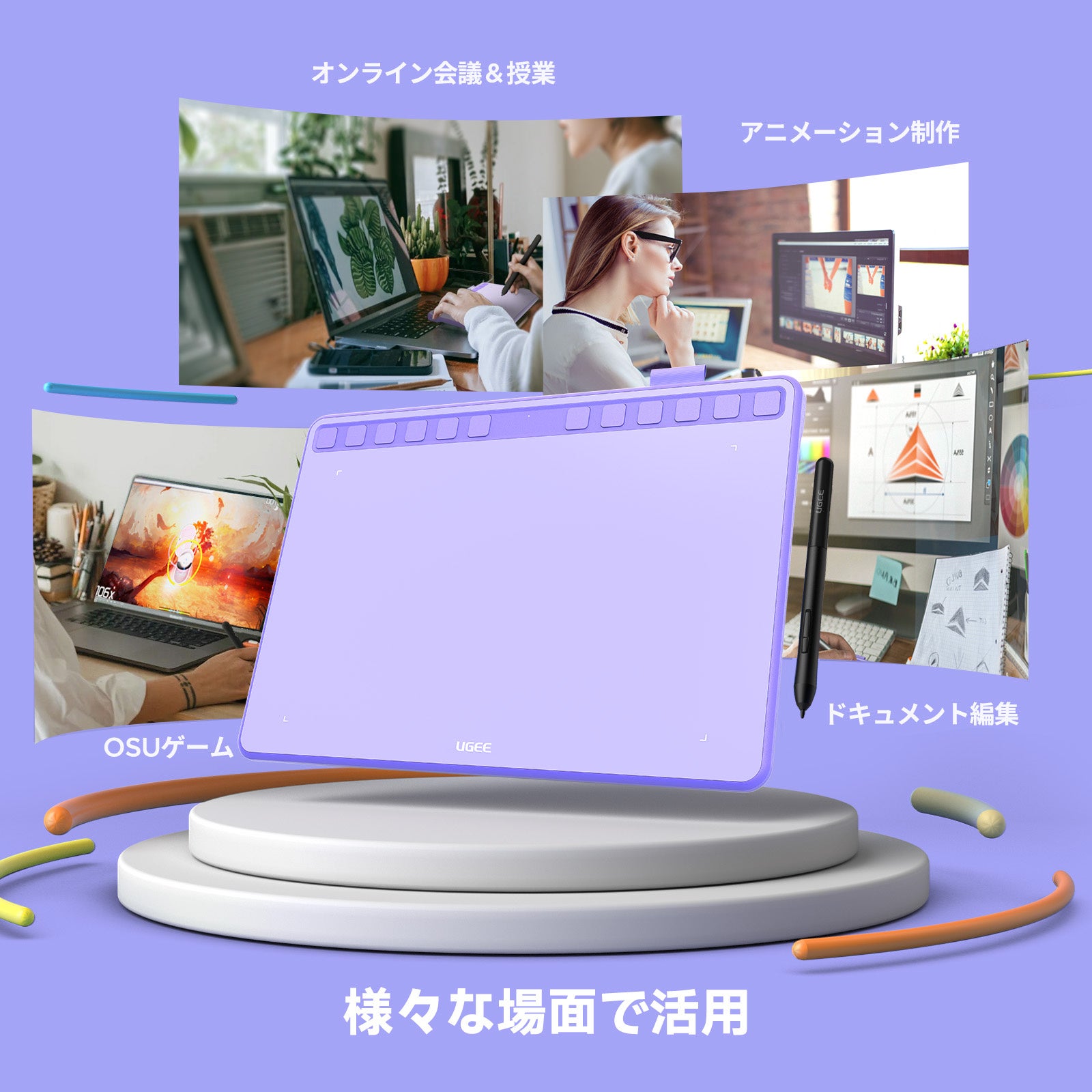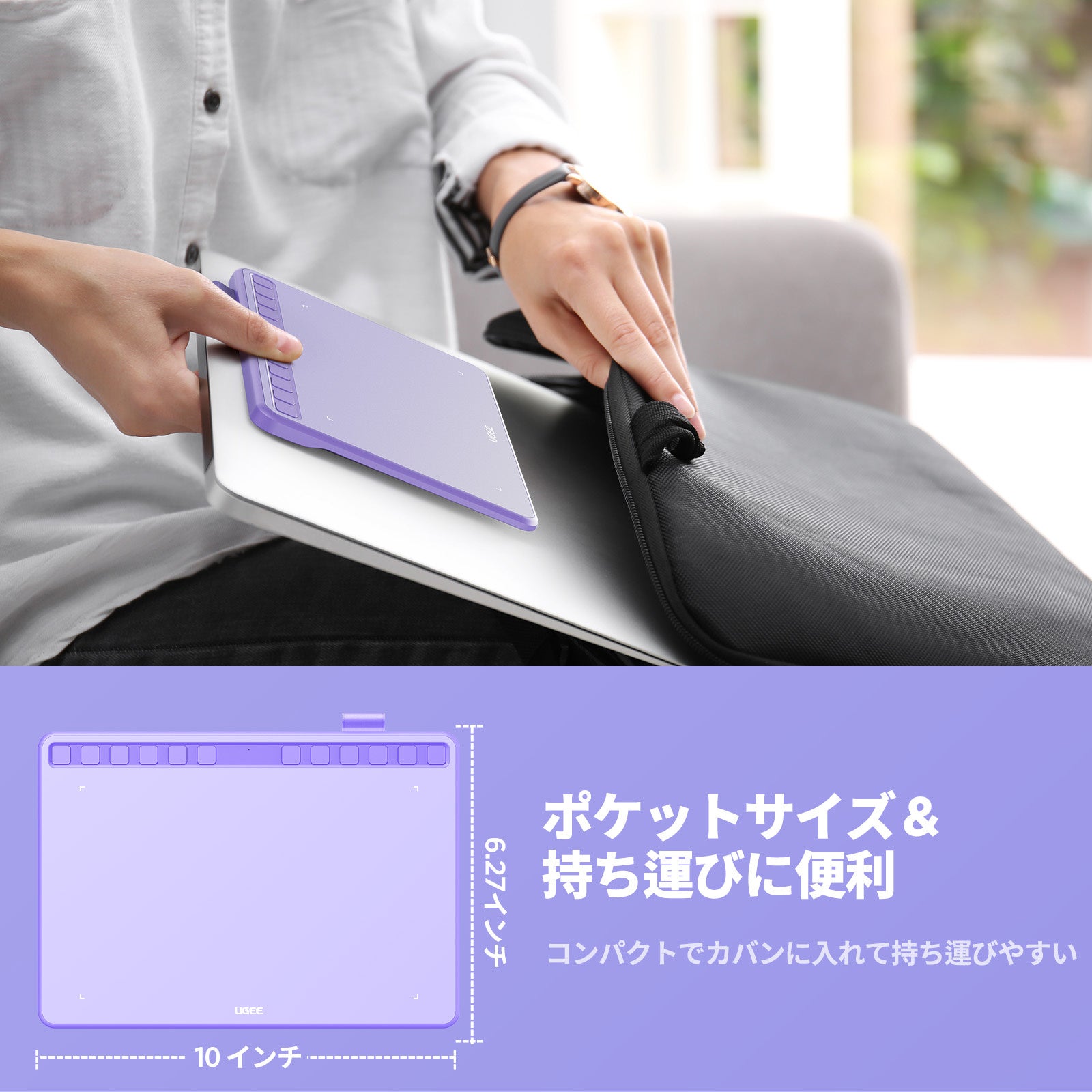(1)「S1060PPペンタブ仕様」UGEE S1060PPペンタブレット(パープル)サイズ:約32.1x22.6cm;描画領域:10x6.27インチ;厚さ:1.2cm;重量:613g。