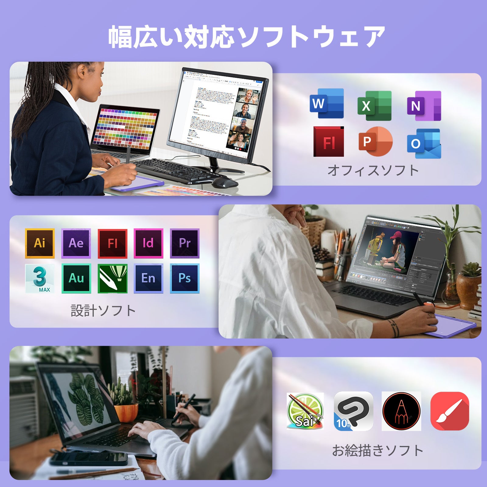 Adobe Photoshop、Illustrator、Clip Studio、Lightroom、 Sketchbook Pro、Manga Studio、CorelPainter、FireAlpaca、OpenCanvas、ペイントツールSai2、Kritaなどのペイントソフトと互換性があります。
