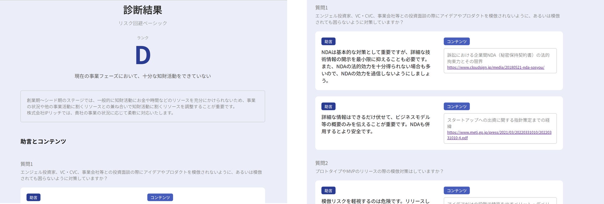 株式会社IPリッチ(本社:東京都渋谷区、代表:草野大悟)は、スタートアップにおける知的財産(知財)における活動や認識を診断し、評価や助言を自動で行うことができる知財診断&簡易コンサルツールを開発し、β版をリリースしました(特許出願済)。