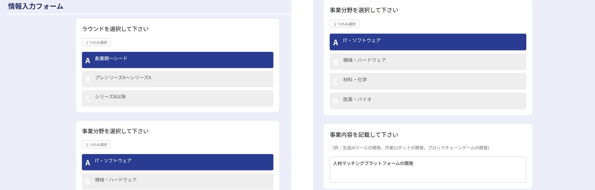 その後は、現在の事業フェーズ(投資ラウンド)、事業分野、経営上の課題、連絡先、相談の希望等を選択・入力します。「送信する」をタップ・クリックすると、評価と助言が表示されます。