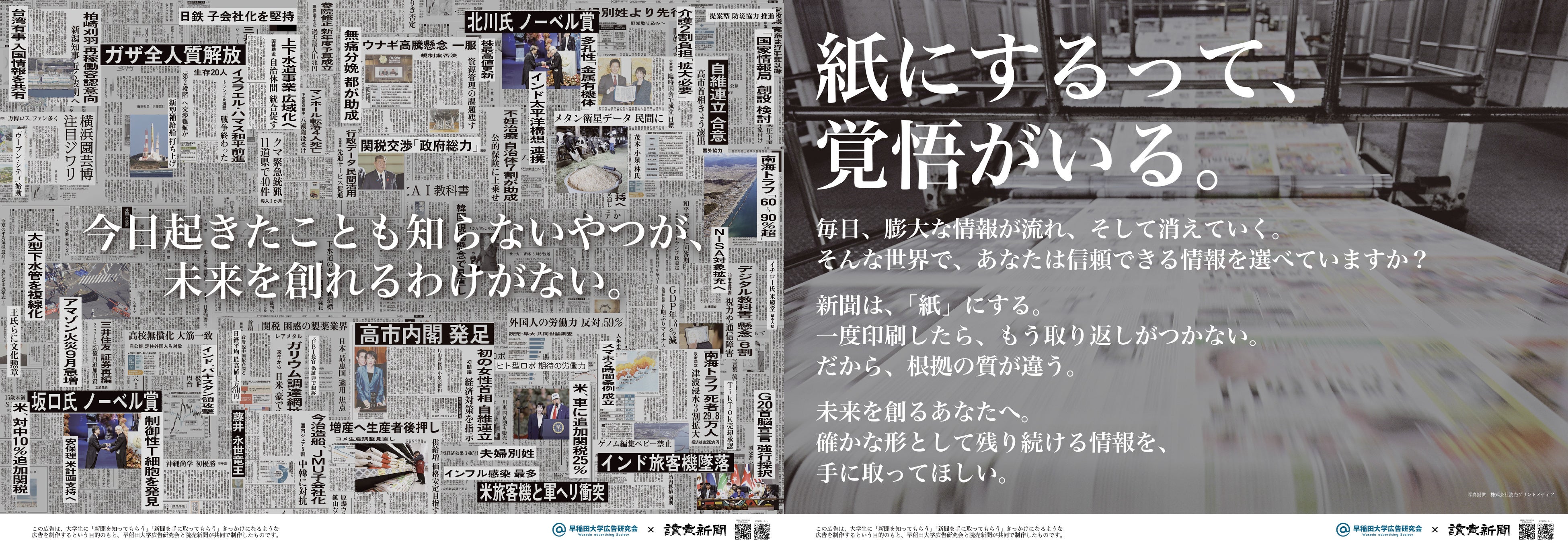 2種類のグラフィック広告が、2026年3月23日から早稲田駅・高田馬場駅に掲出された。就活生の不安や若者のメディア不信を背景に、「新聞の価値」を学生の視点から問い直し、若者が新聞を手に取るきっかけを生み出すことを目指した駅広告プロジェクトである。期間限定で、広告は3月31日まで掲出された。