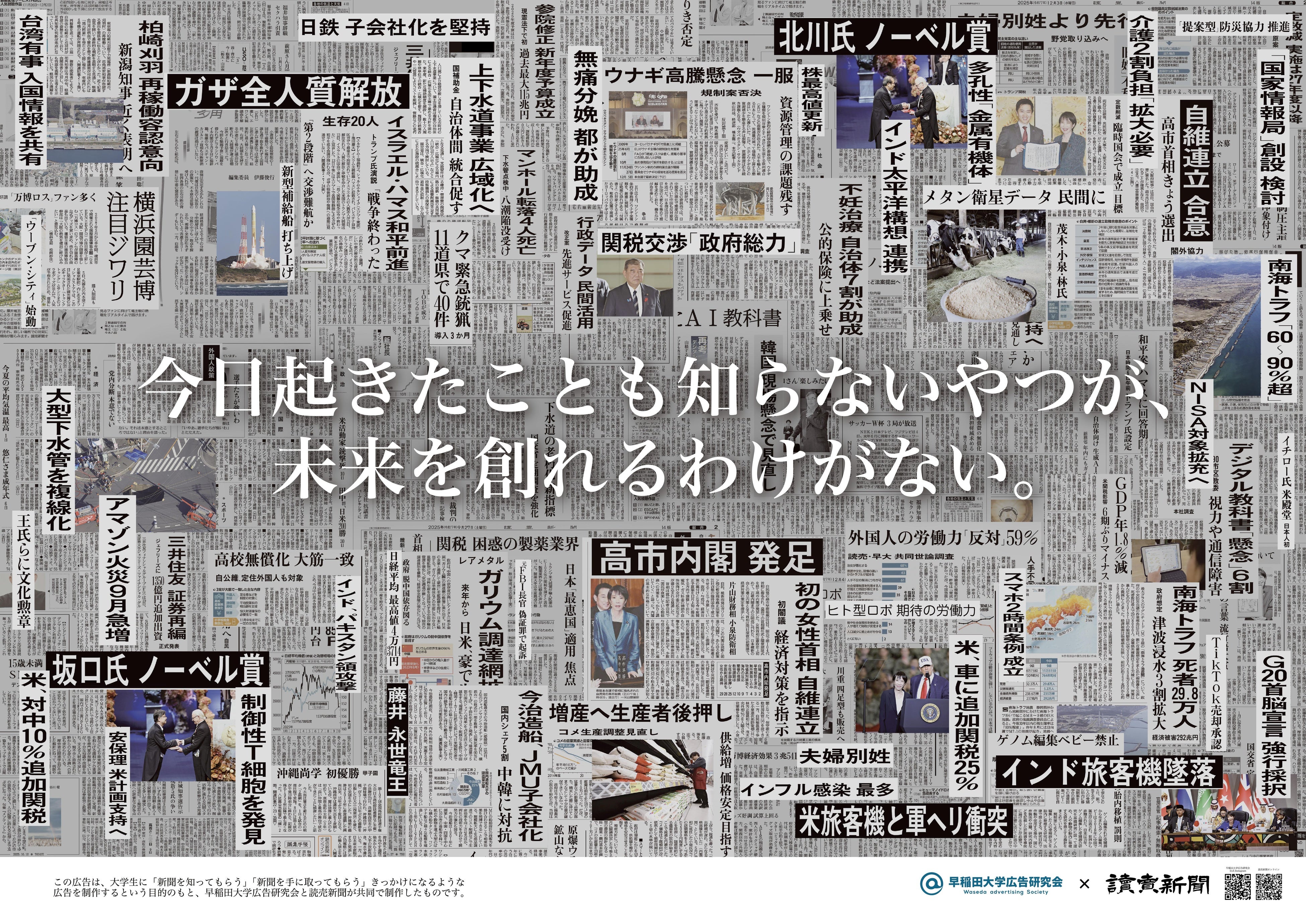 本企画は、早稲田大学広告研究会の有志メンバーが中心となり、読売新聞社と共同で進めた広告制作プロジェクトである。ターゲットは、大学生を中心とした若年層。SNSやデジタルメディアが情報取得の主流となった時代において、「新聞」というメディアが持つ価値は変わりつつある。プロジェクトでは、同世代の視点から再定義を試みるとともに、若者が実際に新聞を手に取るきっかけをつくることをゴールとして、広告表現の設計を行った。