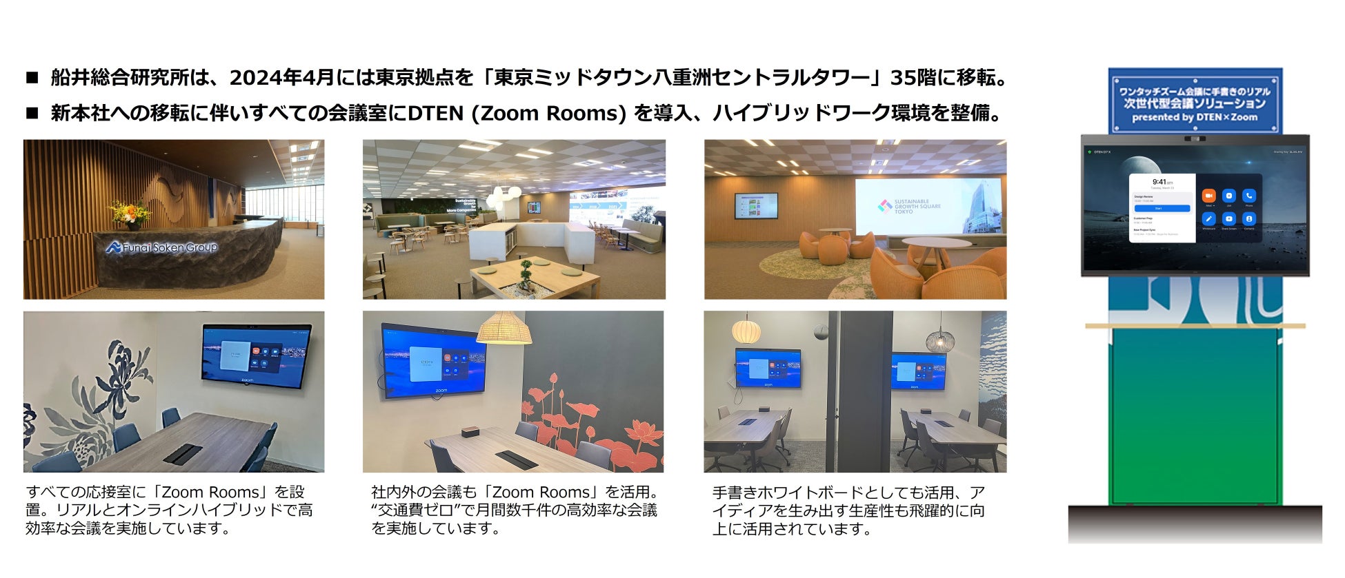 ZVC JAPAN株式会社(Zoom Video Communications, Inc.の日本法人)の代表取締役会長兼社長である下垣典弘氏は、「この度のDTENと船井総合研究所の協業は、日本におけるDX推進を加速させ、我々がコアバリューとして重視してきたお客様や働く方々に「幸せをお届けする」というビジョンにも沿った取り組みです。弊社Zoom Rooms対応のDTEN製品と、船井総合研究所の豊富なコンサルティング経験の融合により、日本全国の企業様の生産性の向上とビジネスの成長を支援できることを非常に嬉しく思いつつまたこのパートナーシップを心より歓迎いたします。」とコメントしています。