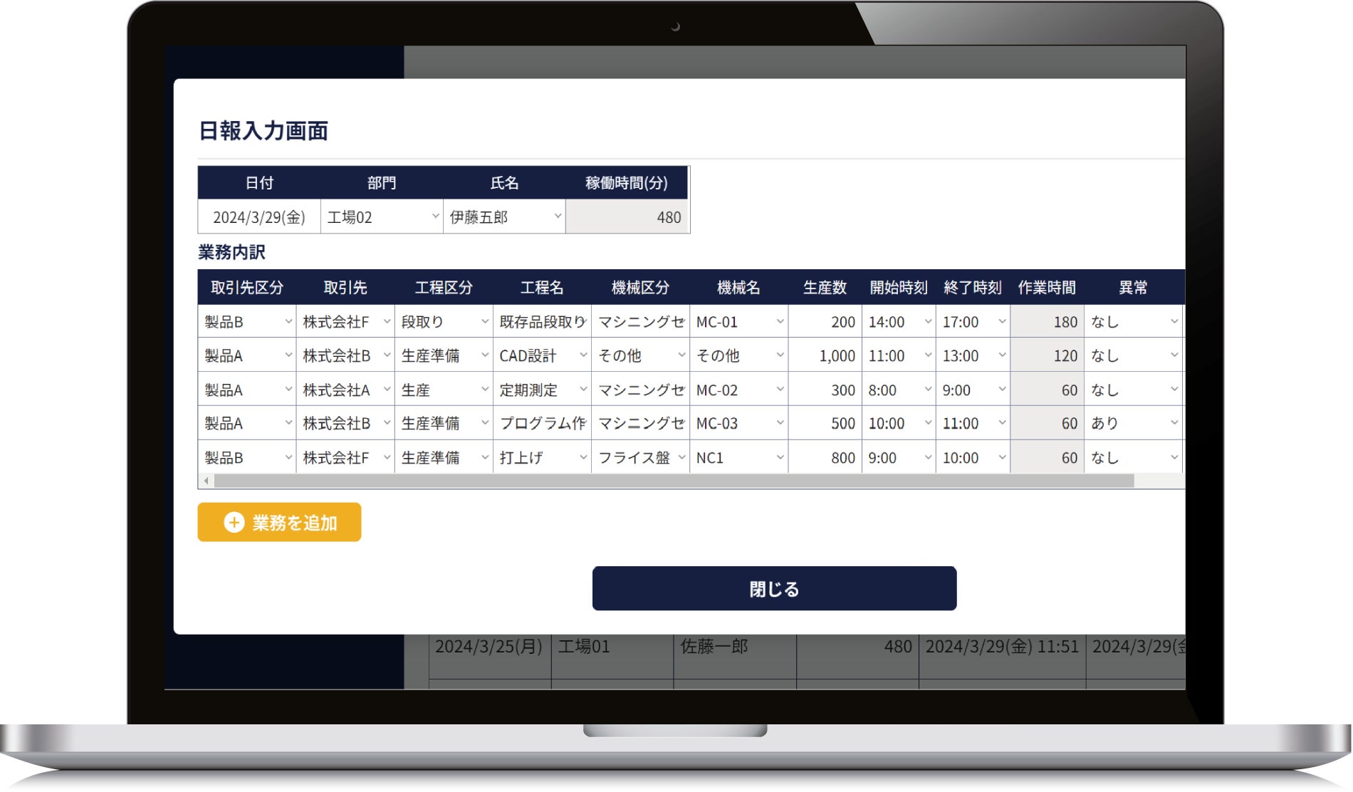 日々の業務に関するデータを蓄積・可視化することで稼働状況や生産状況が一目瞭然。入力項目も柔軟にカスタマイズでき、あらゆる分析ニーズに対応可能です。