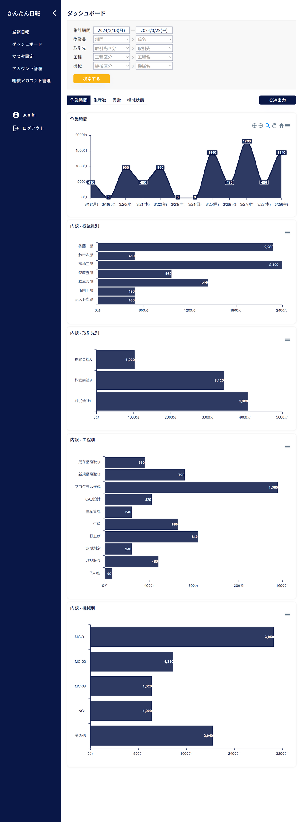 集計を自動化するだけでなく、収集したデータをもとに様々な角度からグラフで可視化することにより、稼働率や生産状況の課題を一目で把握することができます。また、システムに蓄積されたデータはすぐにCSV形式で出力できるため、生産管理システム等との連携も可能です。