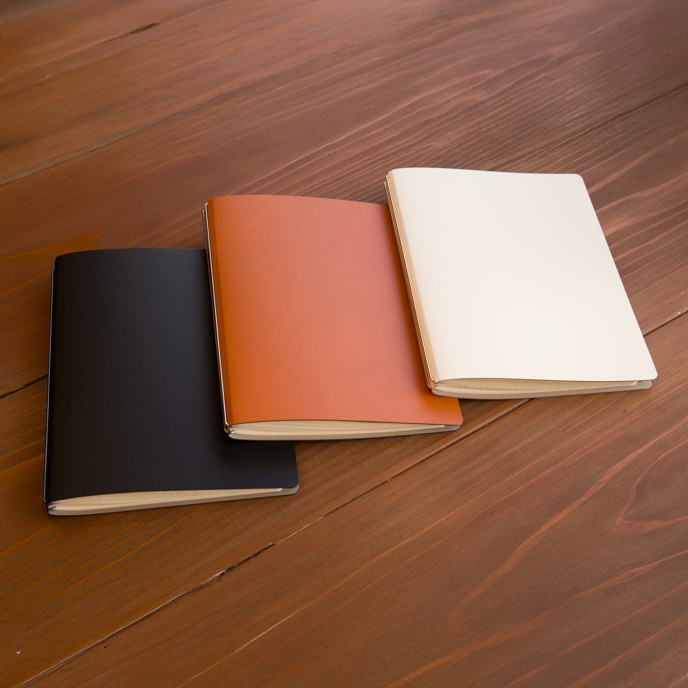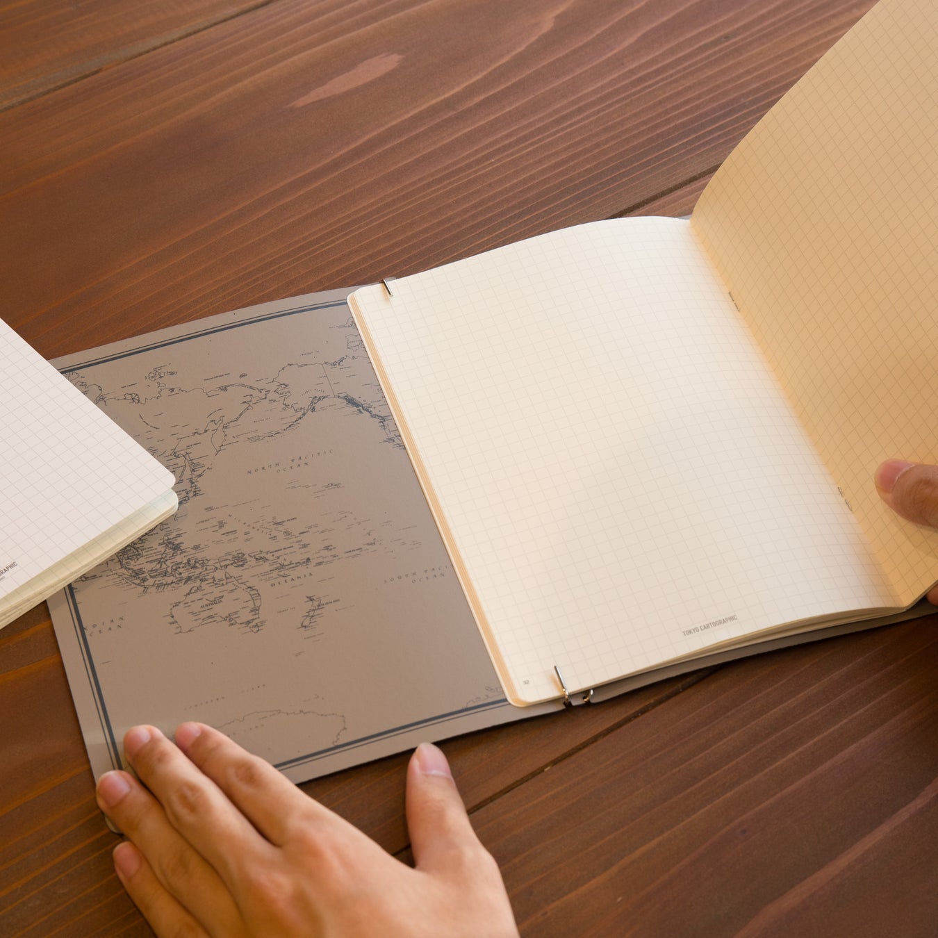 fixieシリーズは、地図制作を手がける東京カートグラフィックが「地図を吊るす姿」から着想を得て開発した新発想のノートカバーです。2本の真鍮製フックバーに中綴じノートを引っかけることで、吊るすように固定できるのが特徴です。シンプルな構造でありながら高い安定感を持ち、縫製をしない1枚素材のカバーは軽くて薄く、持ち歩きにも便利です。