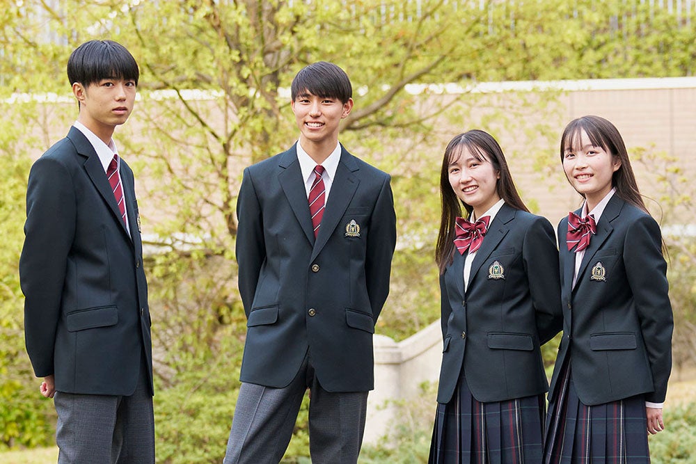 生徒が各自の成長のタイミングに応じて買い替えられるように、中学と高校の制服は同じデザインを採用し、ネクタイ・リボンとブレザーのボタンで区別をしています。高校のネクタイ・リボンは赤、ボタンはゴールドで、中学のネクタイ・リボンはゴールド、ボタンはシルバーです。オプション品として、シャツはクリーム、薄ピンク、サックスブルーを選ぶこともできます。また、ベスト・セーター・カーディガンも用意しています。