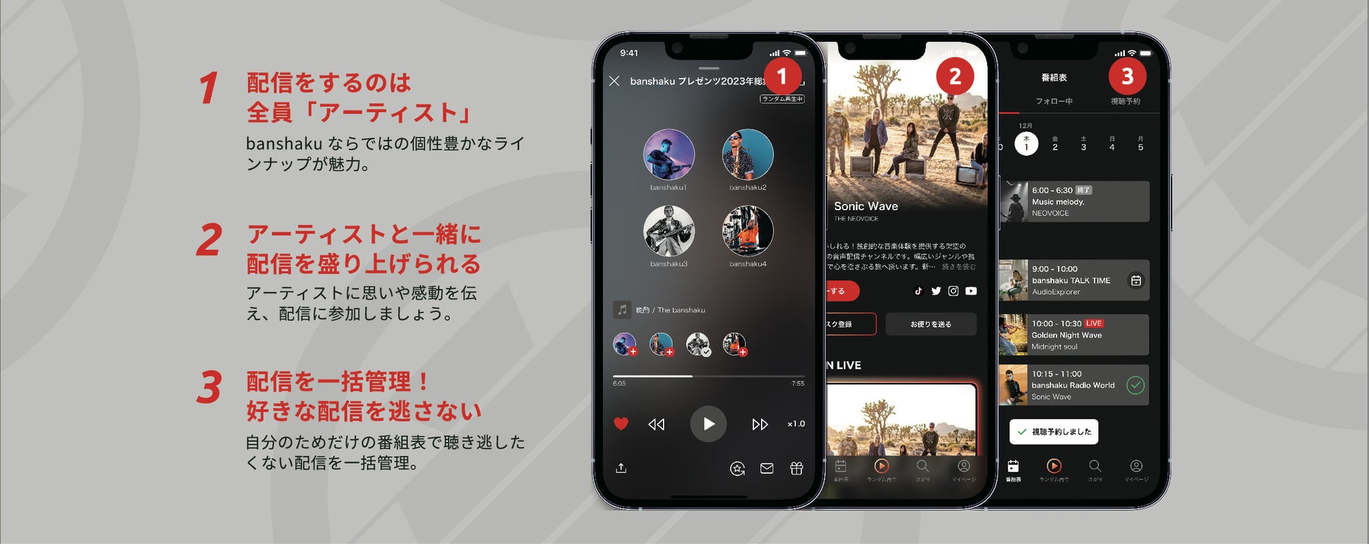 banshakuは審査を通過したミュージシャンなどの音楽関係者のみが配信できる音楽特化型の音声配信アプリです。音楽を流しながらトークが可能な日本初(※)の音声配信プラットフォームとなっています。