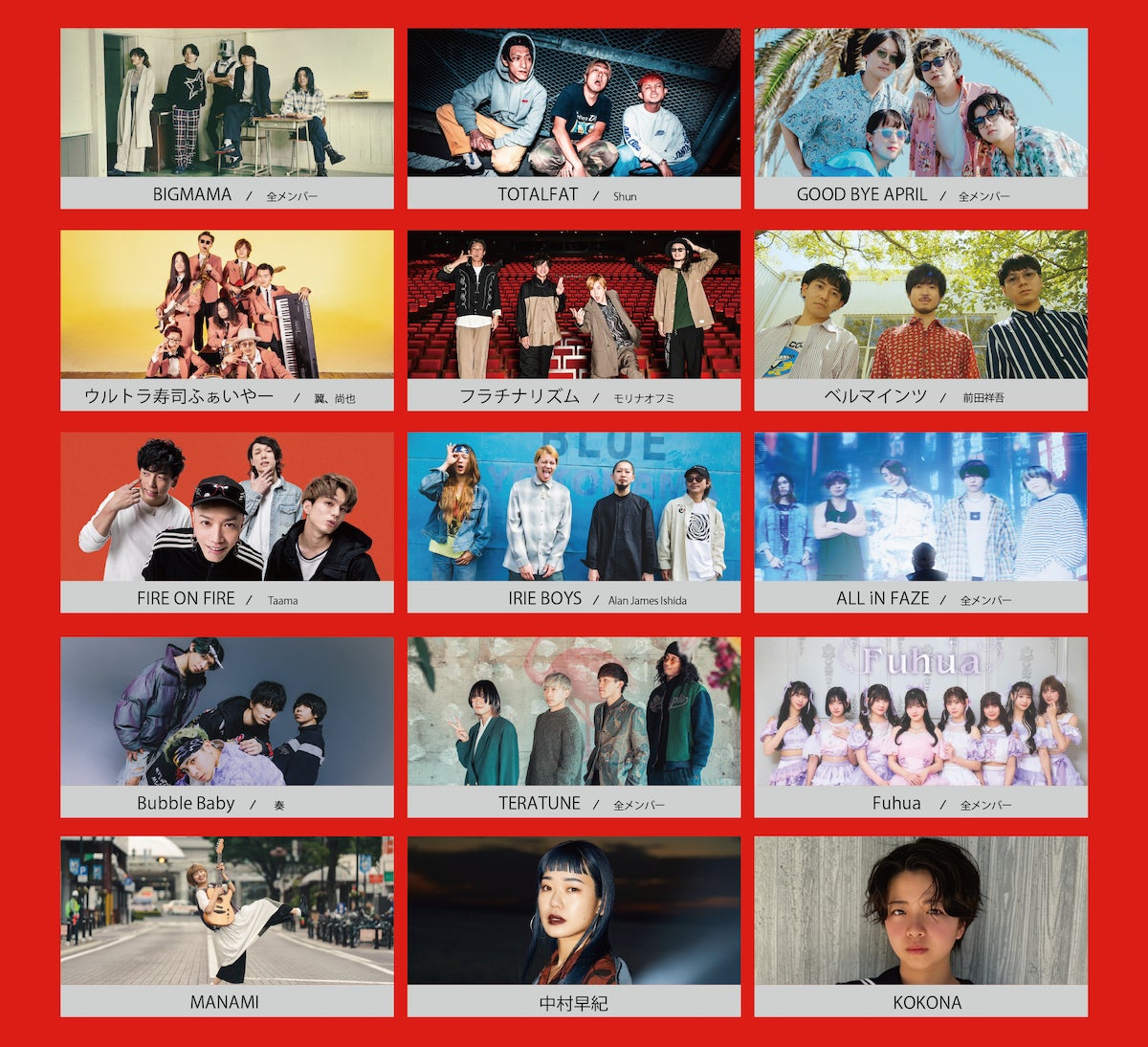BIGMAMA、TOTALFAT(Shun)、GOOD BYE APRIL、ウルトラ寿司ふぁいやー(翼、尚也)、PRAISEなど総勢100名以上のアーティストが配信中。