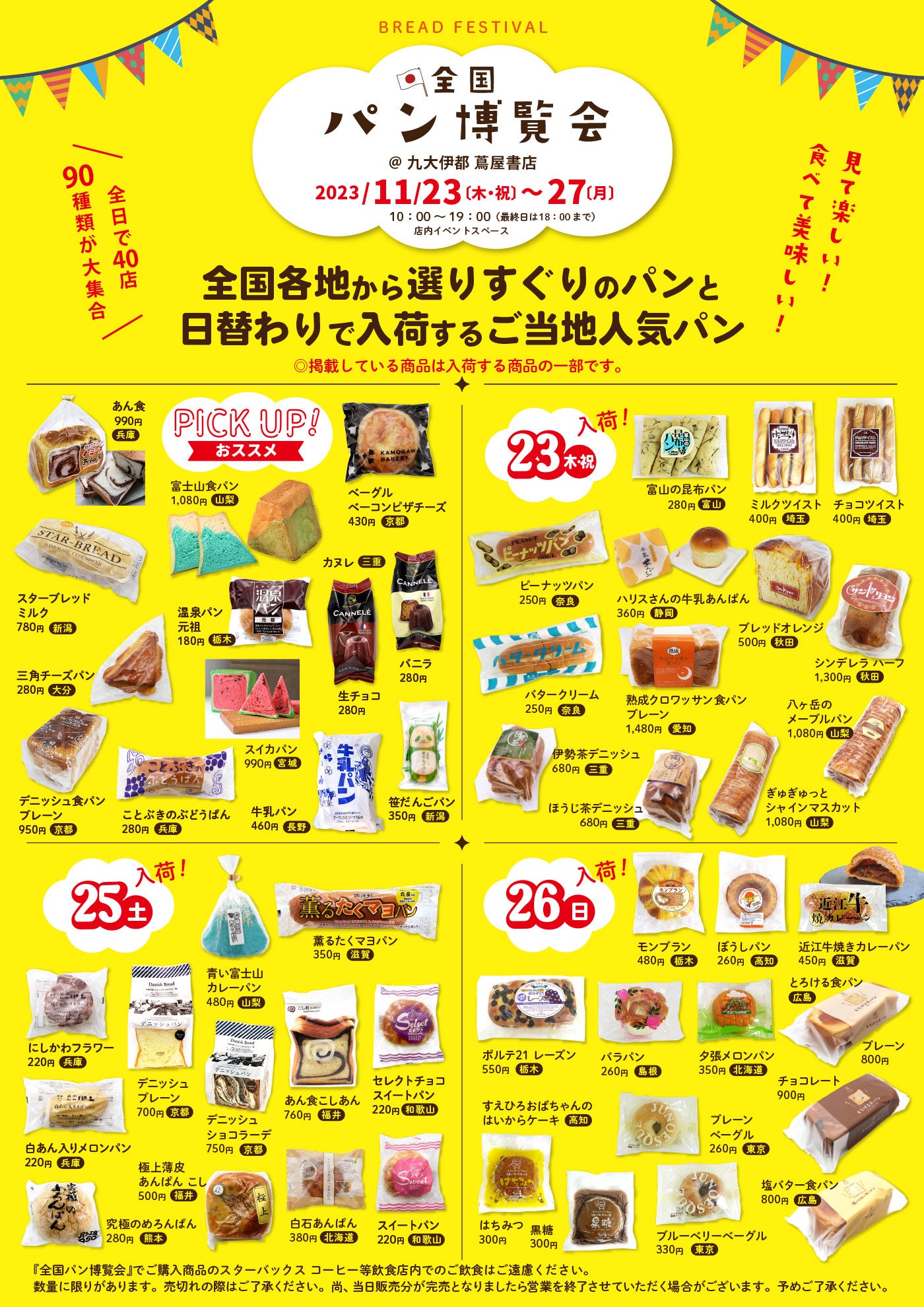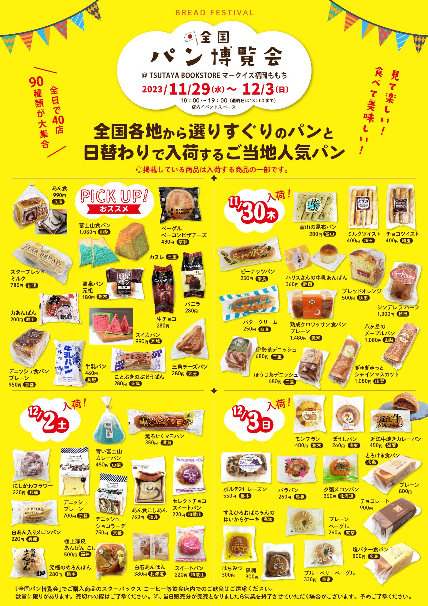 今回は、元祖ご当地パン「トミーズのあん食」(兵庫県)、長野県のソウルフード「牛乳パン」(長野県)、完売必至の「富士山食パン」(山梨県)をはじめ、各地域で愛されるパンやお取り寄せで人気のパンが登場します。九州エリア初出品となる日替わり商品も含め、全国各地から厳選したパンが期間中に同イベント最大級の90種類以上が揃いますので、ぜひこの機会にご来店ください。