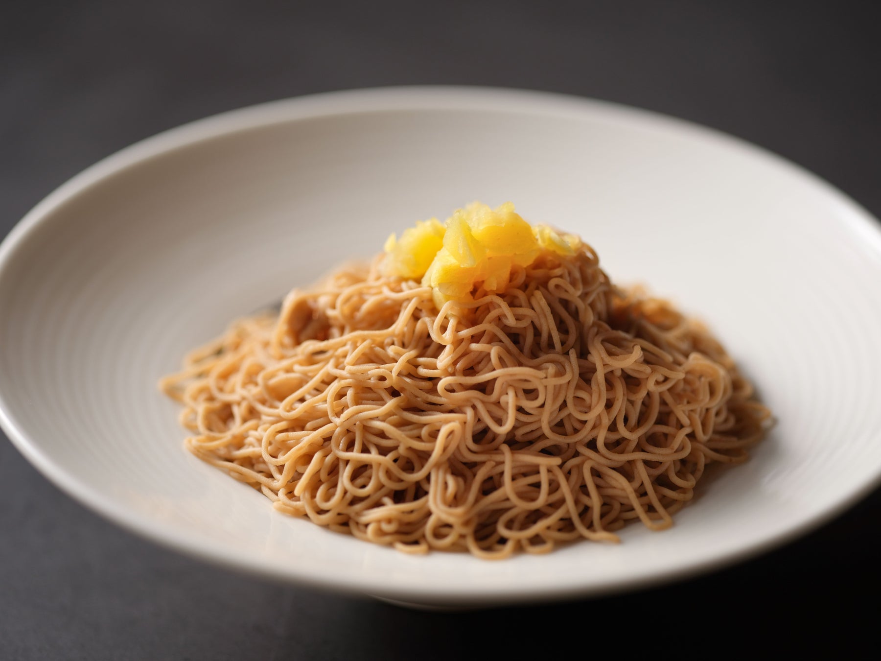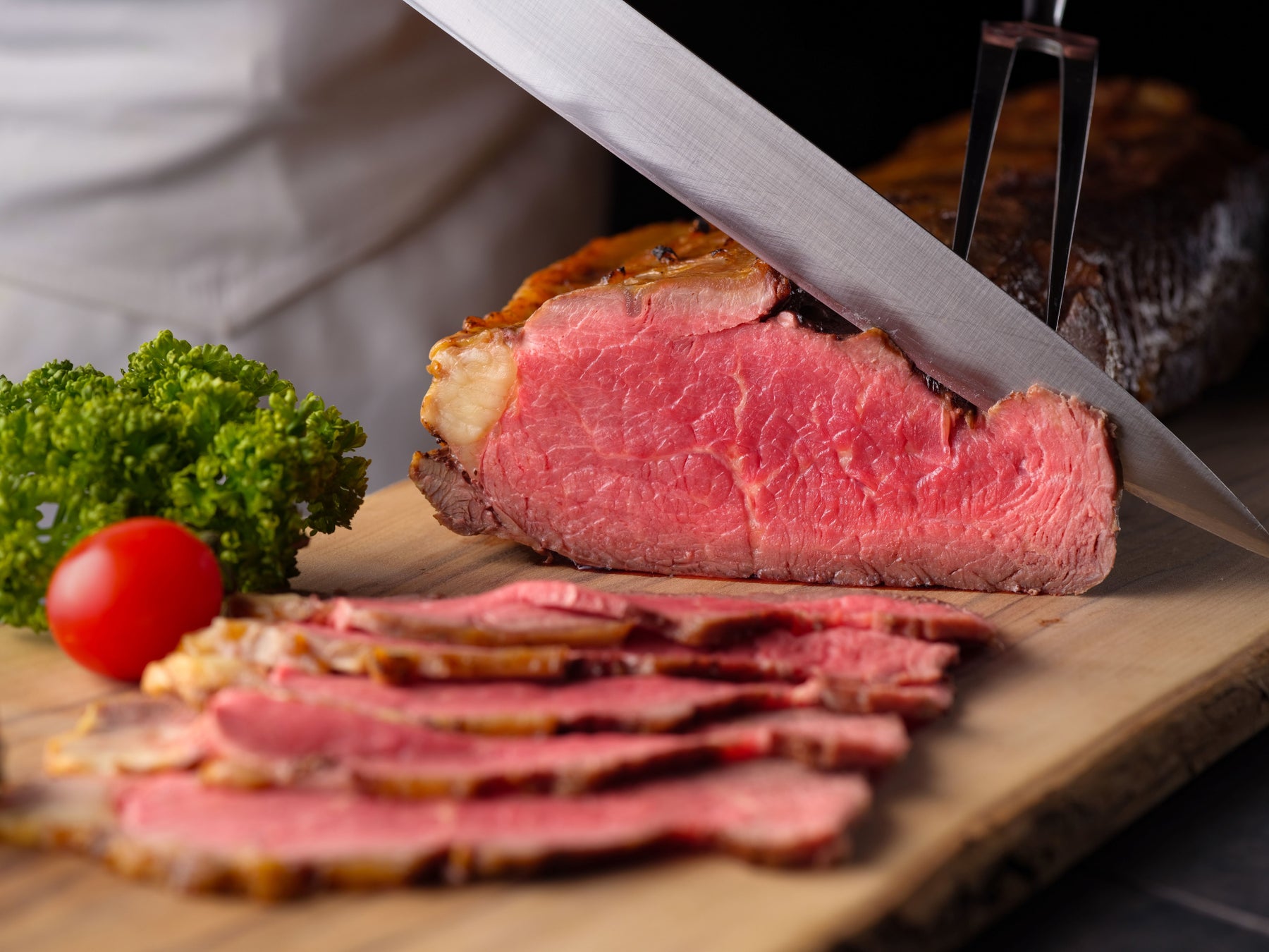 ホテル調理長の小川が、一本一本丁寧に脂肪分や筋を取り除き、オーブンでじっくりと焼き上げたローストビーフ。シェフがお客様の目の前で切り分け、丁寧に皿に盛り付けてご提供致します。わさび醤油や専用ソースでお召し上がりください。