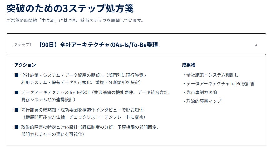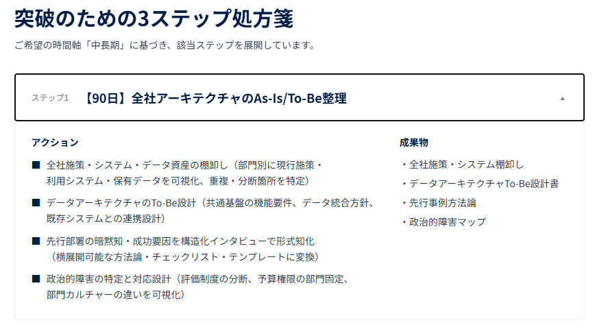 診断結果をもとに、90日以内に着手すべきこと、半年で達成すべきこと、1年で完成させるべきことを、タイプ別に具体的なアクションと成果物まで明示します。Gooserが実際のコンサルティング現場で提供している方法論を、無償で公開するものです。