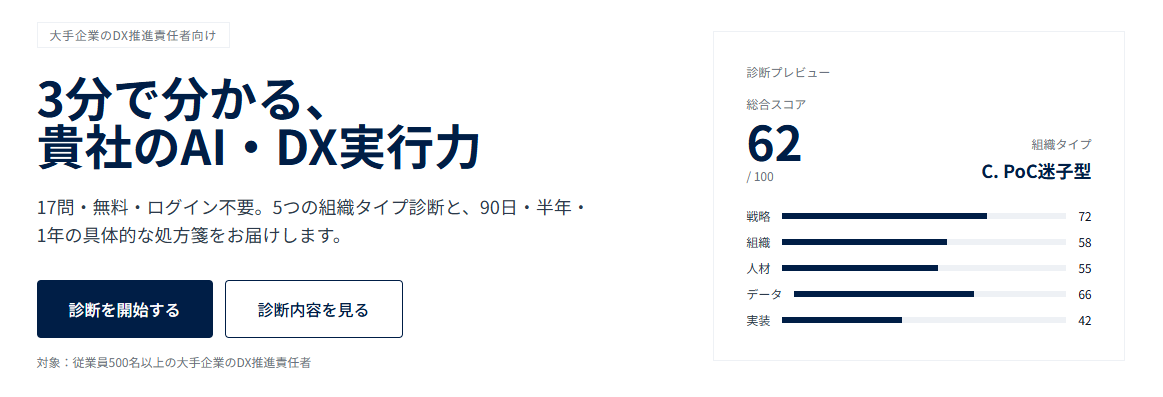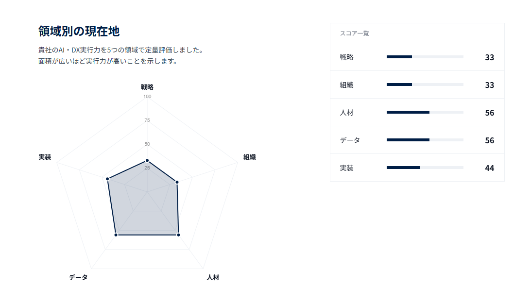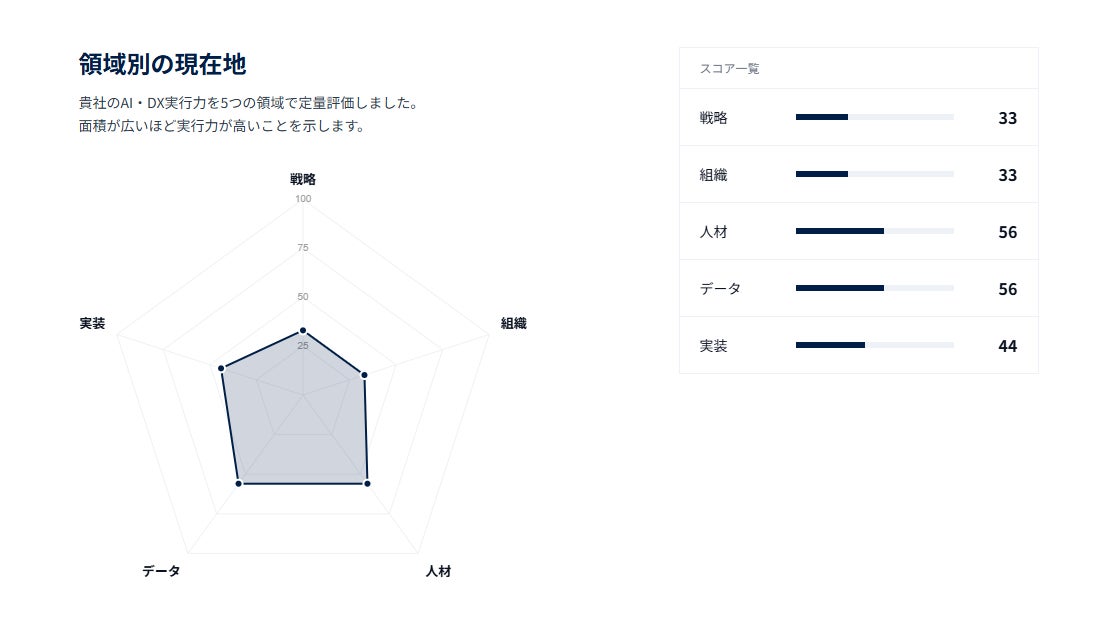 本ツールは、わずか3分・17問の回答で、貴社のAI・DX推進を「戦略/組織/人材/データ/実装」の5領域で定量評価し、パーソナライズされた改善ロードマップを無料で即時提供します。「AIに関心はあるが、何から手を付けるべきか分からない」「PoCは実施したが、本番運用に至っていない」といった課題に対し、次の一手を可視化します。
