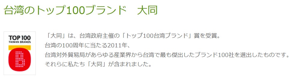台湾の大同公司とは、100年以上歴史ある台湾を代表する総合電機メーカー。大同日本(株)は、「大同公司」資本100%の子会社です。1918年に創立した大同公司は、各種の家電をはじめ、重電(モーター、ケーブル、変圧器)、スマートメーターなどを取り扱いしております。大同日本株式会社は、1975年(昭和50年)8月1日設立しました。会社的に信頼される企業として、持続的な成長を目指し、社会貢献に積極的に取り組んでまいります。日本から資材設備の調達や日本企業との技術提携もしており、日本と台湾の貿易業務や日台文化交流の促進を励んでおります。