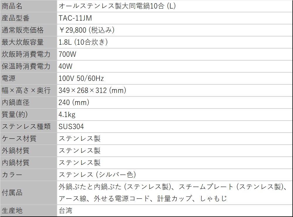 台湾を代表する調理家電「大同電鍋」の企画・販売を手掛ける大同日本株式会社(本社:東京都千代田区・代表取締役:游 明德)は、日本市場向けに新たなオールステンレス製モデル「TAC-11JM」(10合炊き) を発売いたします。