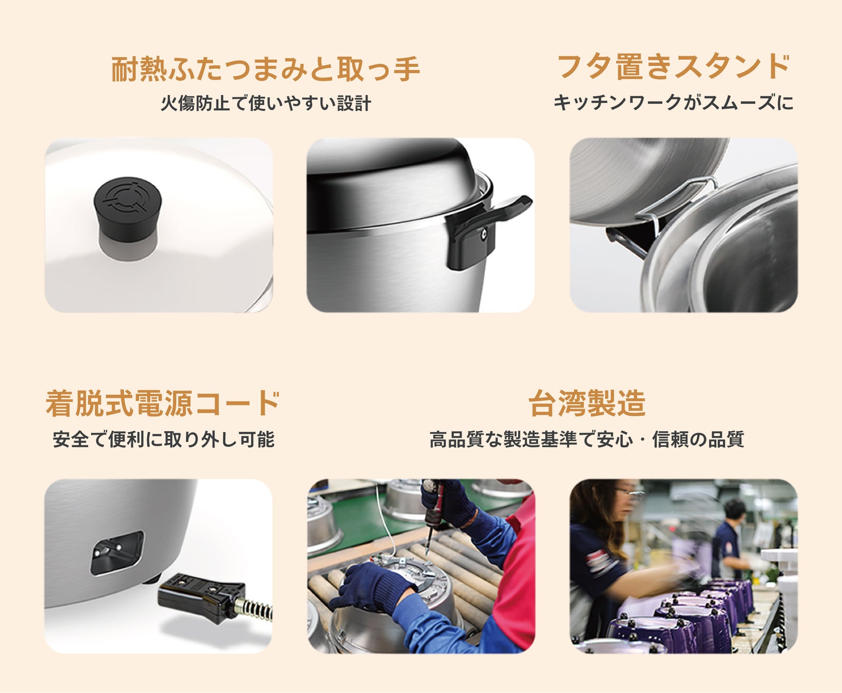 本製品は、長年愛され続けた大同電鍋の基本デザインと多機能性受け継ぎつつ、ケースを完全にステンレス仕様に変更し、操作パネルも一新しました。オールステンレスならではの高い信頼性と、上品でスタイリッシュな印象を実現し、調理の楽しさをさらに高める一台です。