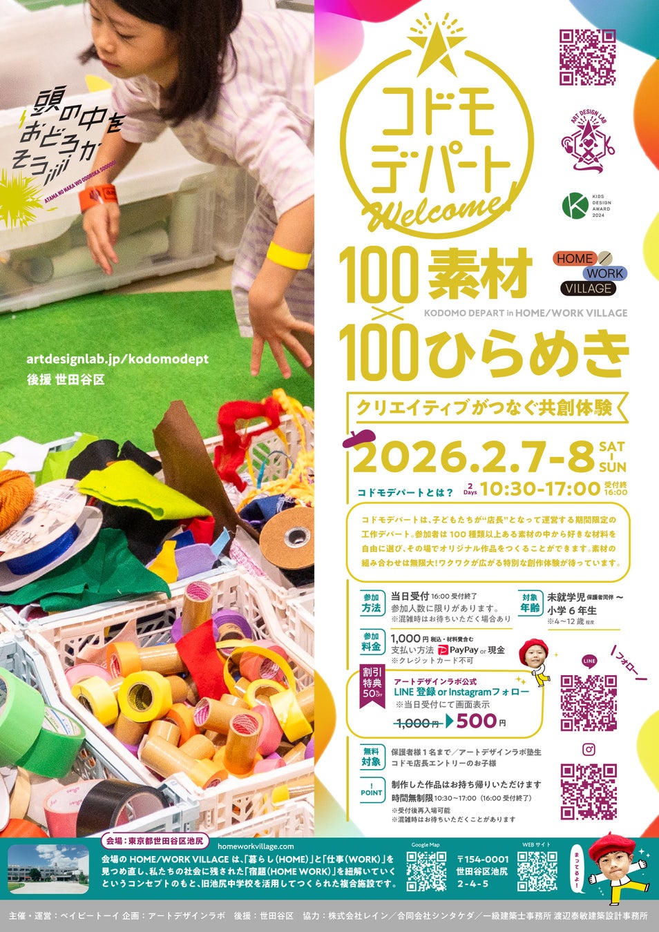 4歳からのクリエイティブスクール、アートデザインラボ(東京都世田谷区/運営:ベイビートーイ)は、体験型アートイベント「100素材×100ひらめき コドモデパート」を2026年2月7日(土)・8日(日)、HOME/WORK VILLAGE(世田谷区・池尻)にて開催します。
