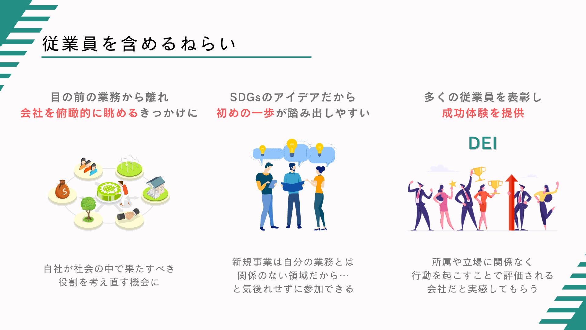 一般の消費者とインタラクティブに関わり合いながら進めるSDGs活動としての側面、社員の主体性とエンゲージメントを高める側面、二つの独自メリットを提供する新しいサービスです。