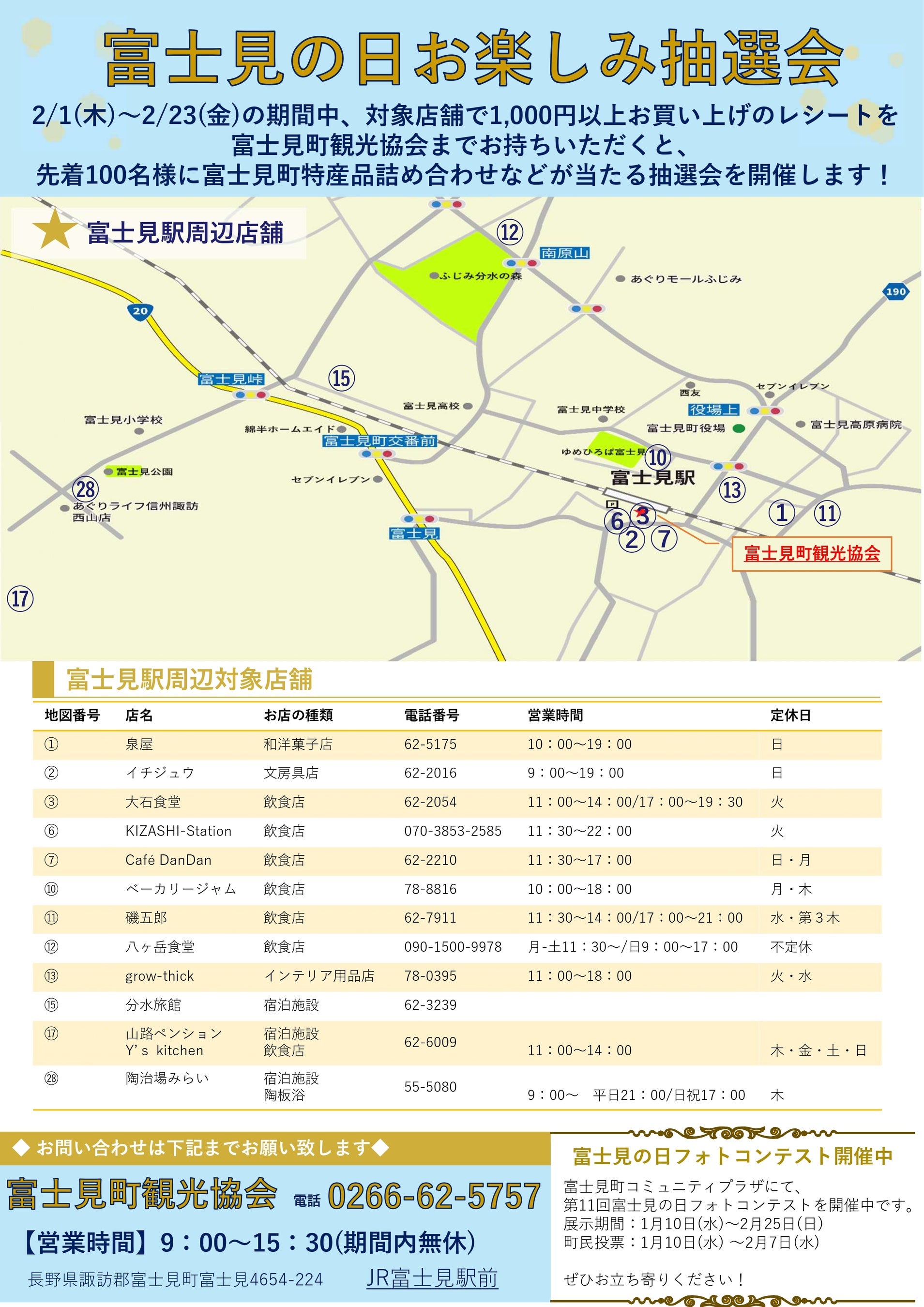 富士見の日 お楽しみ抽選会 | 2/1(木)~2/23(金) | 富士見町観光案内所へレシート・領収書持参 | 対象店舗にて1,000円以上お買い上げで先着100名様に特産品が当たる抽選会参加 | 富士見町観光協会 ☎0266-62-5757 |