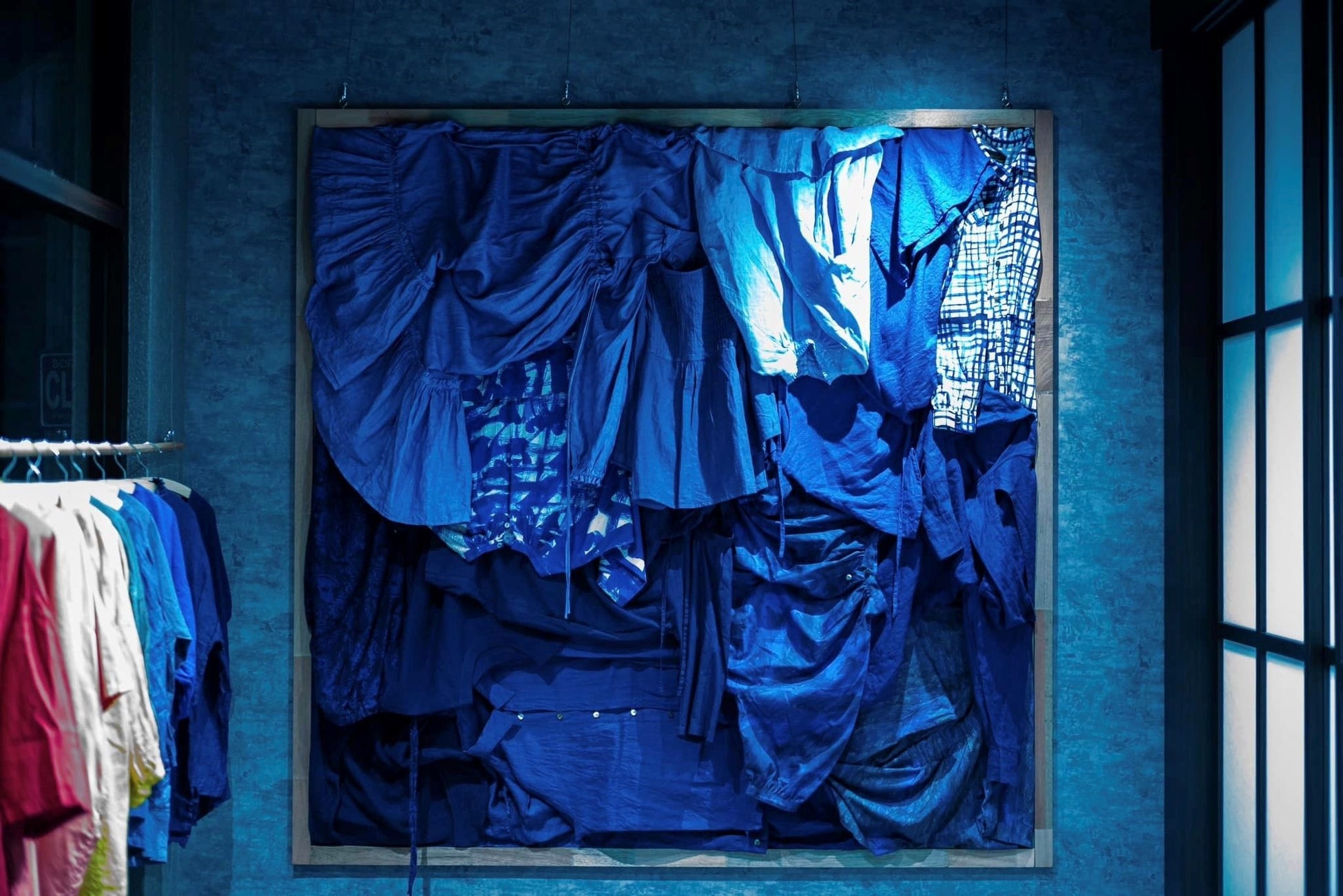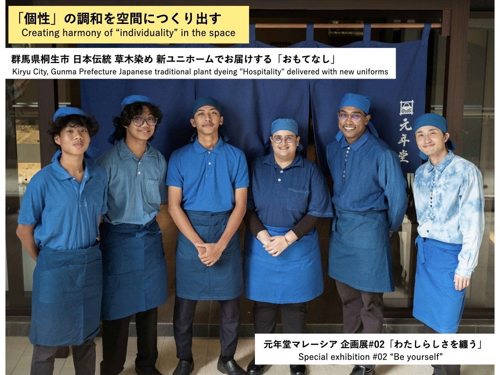 企画展 第二弾「わたしらしさを纏う」は、企画展エリアにおける展示だけでなく、「元年堂」の店舗空間全体を使った企画となっています。日本伝統 草木染めで施された一点ものの新ユニホームを着た現地スタッフが日本の心をもってお客様に「おもてなし」を提供いたします。『「個性」の調和を空間につくりだすこと』を意識し、日本の伝統文化でもある草木染めの技法を用いて、衣服一着一着を異なる色温度で染め分けることで個性を表現し藍色にまとめた空間全体で調和を表現しました。