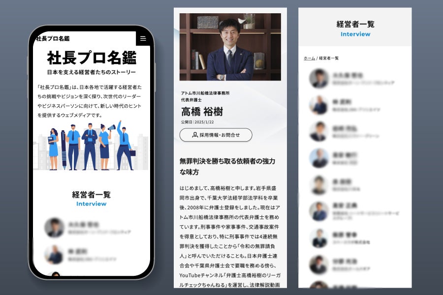 アトム法律グループの一員であるアトム法律情報株式会社が立ち上げた本メディア。2025年2月の公開後、掲載ページの9割以上が「会社名+社長名」のGoogle検索で3位以内に表示されるなど、社長の人となりや考え方を知りたい方に届けるツールとして活用いただけます。