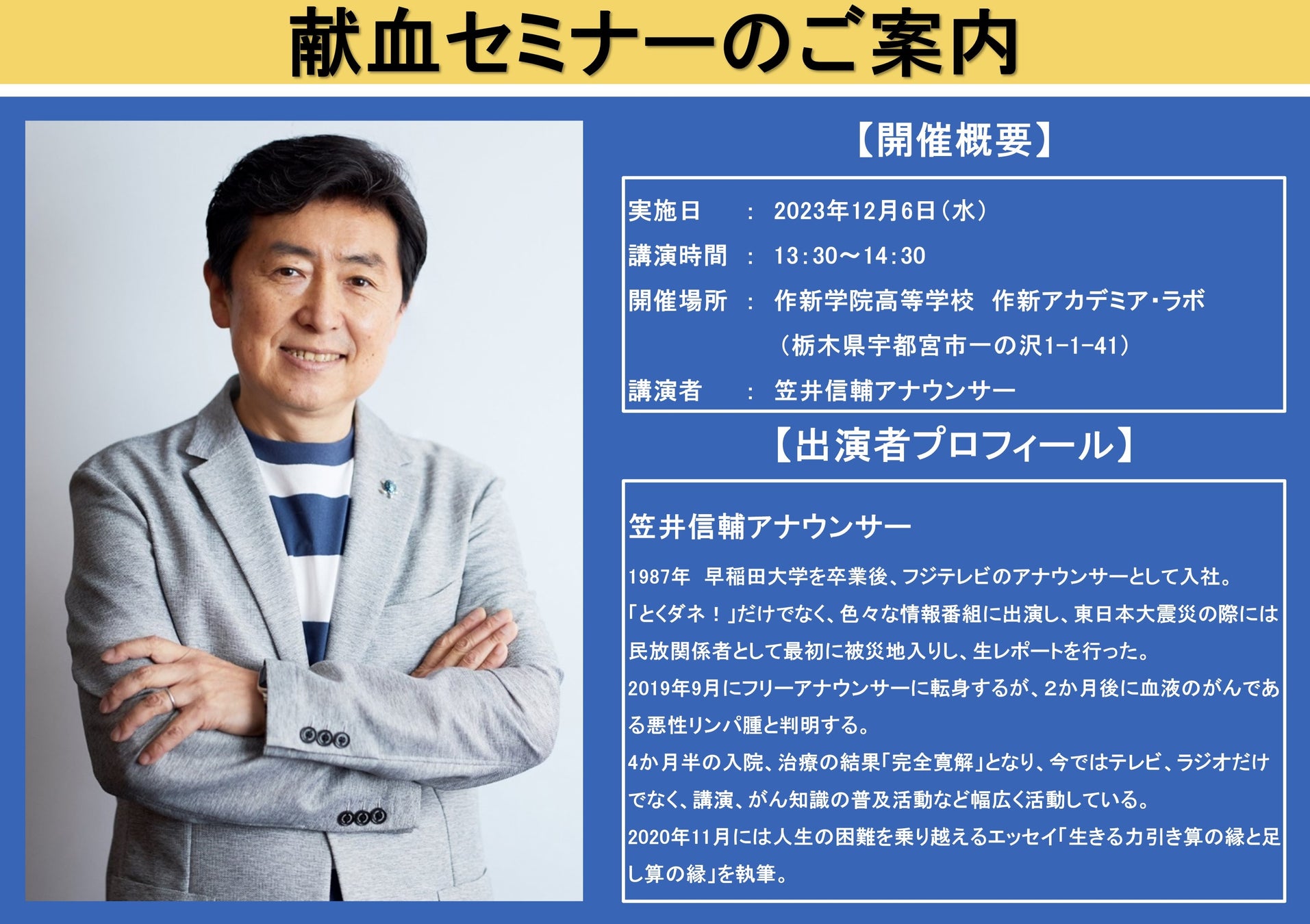 輸血経験者である笠井信輔アナウンサーを迎え、ご自身の闘病体験、輸血治療の経験を通して、作新学院高等学校の生徒の方を対象に「献血」の大切さを伝えていきます。