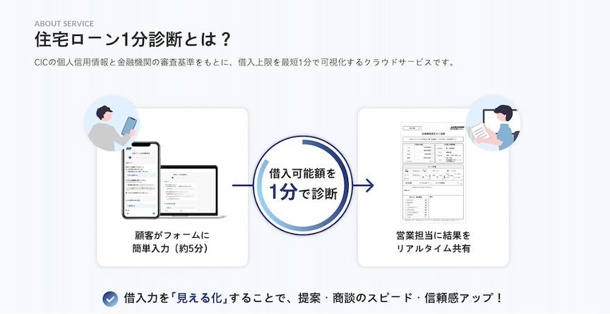 「住宅ローン1分サービス」は、信用情報機関のCICと金融機関の審査基準データベースをもとにした精度の高い診断により、借入可否をスピーディに表示するクラウドサービスです。