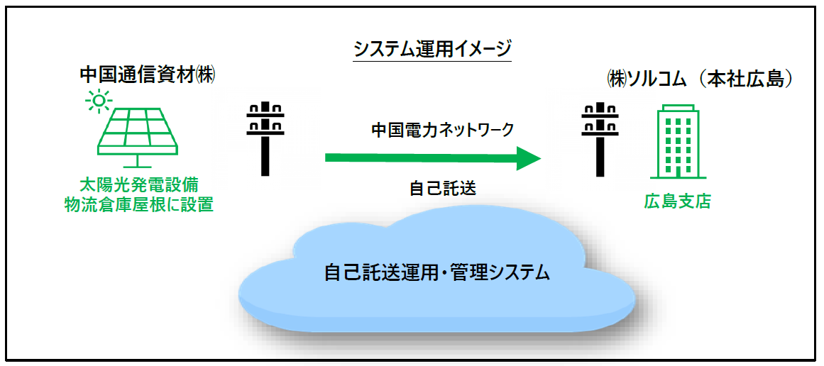 ミライト・ワン グループで実施する本実証運用においては、ミライト・ワンがソルコムグループ会社の中国通信資材の物流倉庫屋根上(広島県東広島市)に太陽光発電設備を設置し、離れた場所にあるソルコム広島支店ビル(広島県広島市)へ発電した電力を供給します。中国通信資材が太陽光発電設備に必要な設置場所を提供し、ミライト・ワンとソルコムが協力して自己託送に必要な契約、手続き、施工、運用を担当します。運用を通し、需要場所における電気の消費量や発電場所における発電量に関する予測精度の向上に取り組み、予測差が発生した場合のインバランス料金の最小化を目指します。なお、今回の自己託送の送電する電力量は、現在のソルコム広島支店の消費電力量の約3割を想定しています。