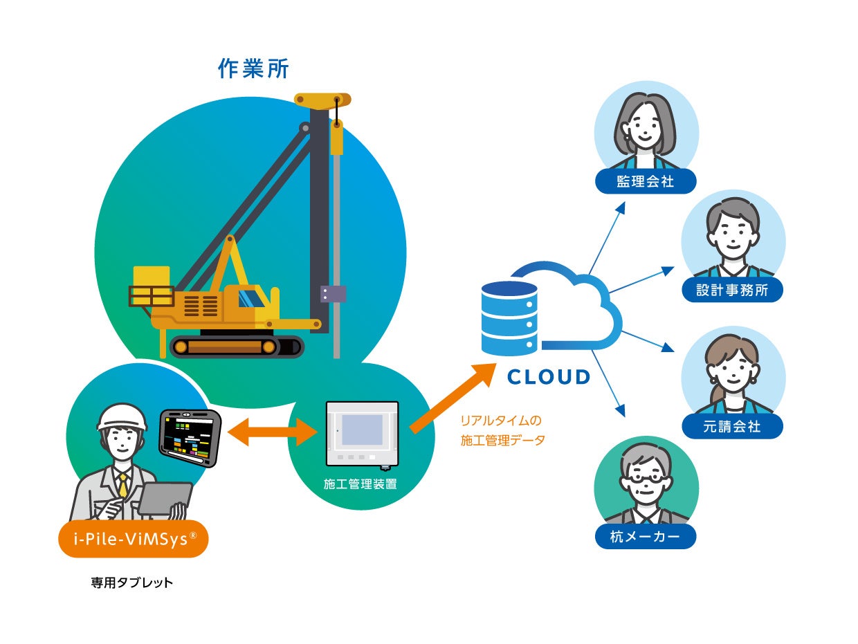 「Pile-ViMSys®」は、既製コンクリート杭工事において、施工管理に必要な掘削深度や支持層確認のための電流値、セメントミルク量など施工品質に係るデータを自動でクラウドアップし見える化することで、リアルタイムに遠隔から確認及び承認できるICT施工管理システムになります。