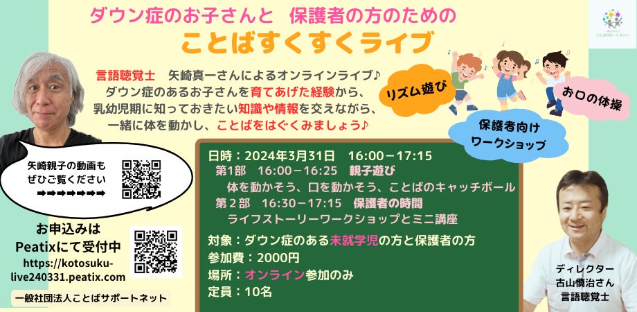言語聴覚士を中心に設立された非営利団体である一般社団法人ことばサポートネットは、2024年3月31日(日)午後4時より、ダウン症のお子さん(未就学児)とその保護者の方を対象としたオンラインイベント"ことばすくすくライブ"を開催いたします。