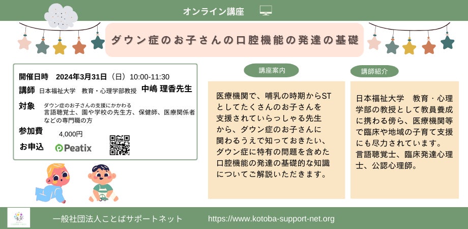 午前10時には、日本福祉大学の中嶋理香教授を講師に招いて、ダウン症をサポートする言語聴覚士、保健師、保育士などの専門職向けオンライン講座『ダウン症のお子さんの口腔機能の発達の基礎』を開催いたします。