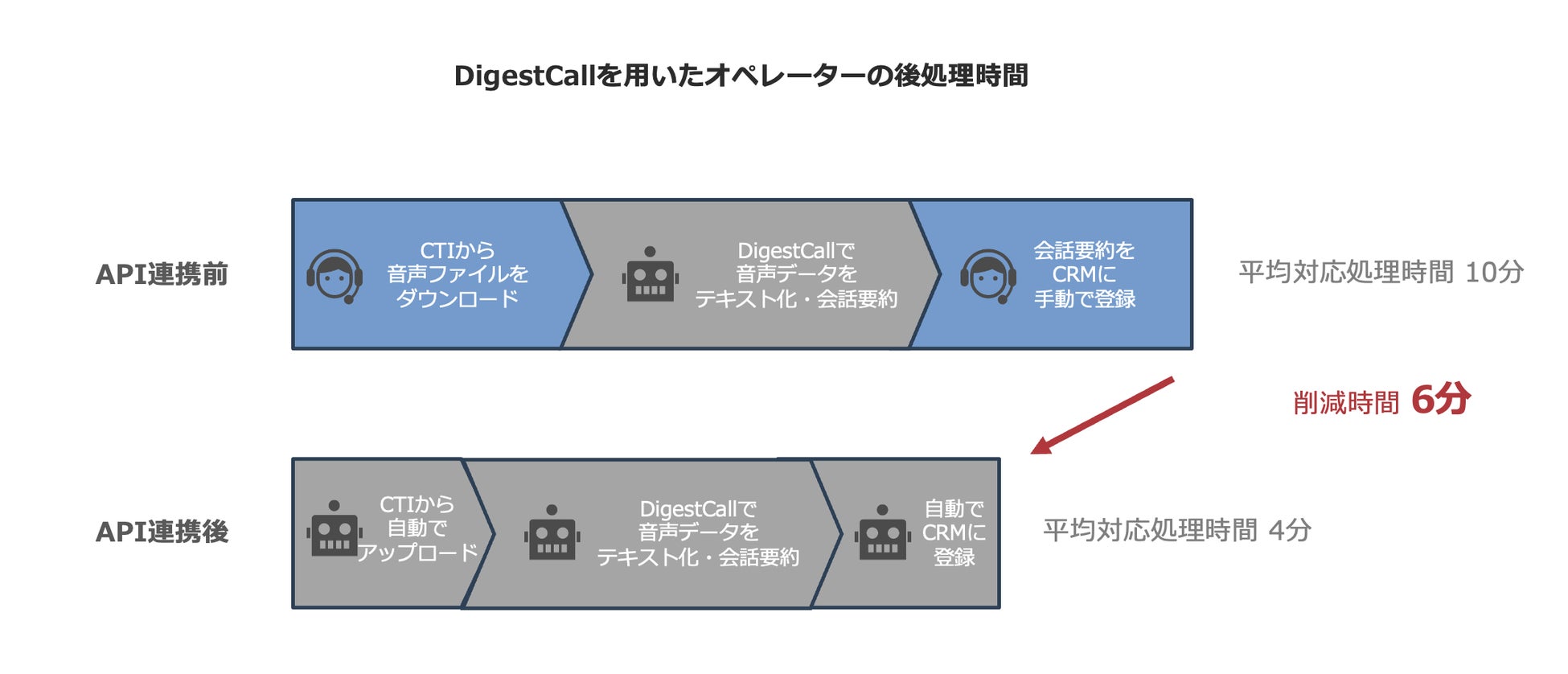 今回、新たにCTIやCRMとのAPI連携機能を実装することで、通話終了後の音声データが自動的にDigestCallに送られ、音声データ処理が完全自動化されます。この機能により、従来の手動アップロードの手間が不要となり、後処理時間を大幅に削減することが可能です。