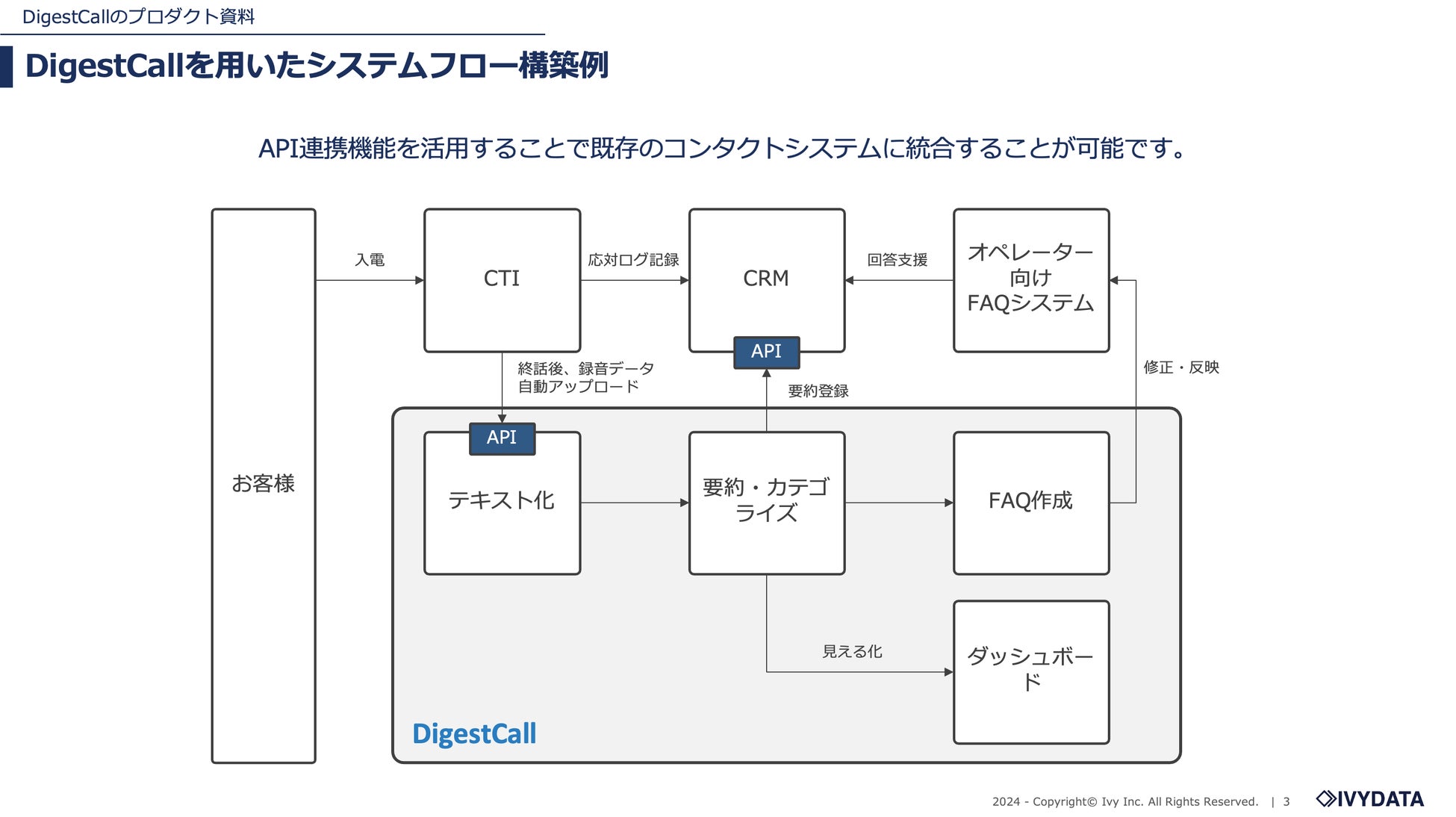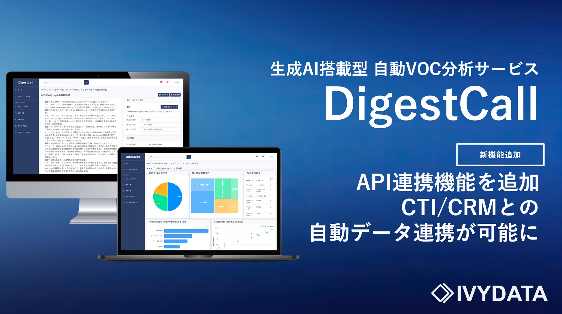 株式会社アイビーデータ(本社:東京都渋谷区、代表取締役 鈴木航介、以下「当社」)は、生成AIを活用した音声データ分析サービス「DigestCall」において、CTIやCRMとのAPI連携機能の提供を開始しました。