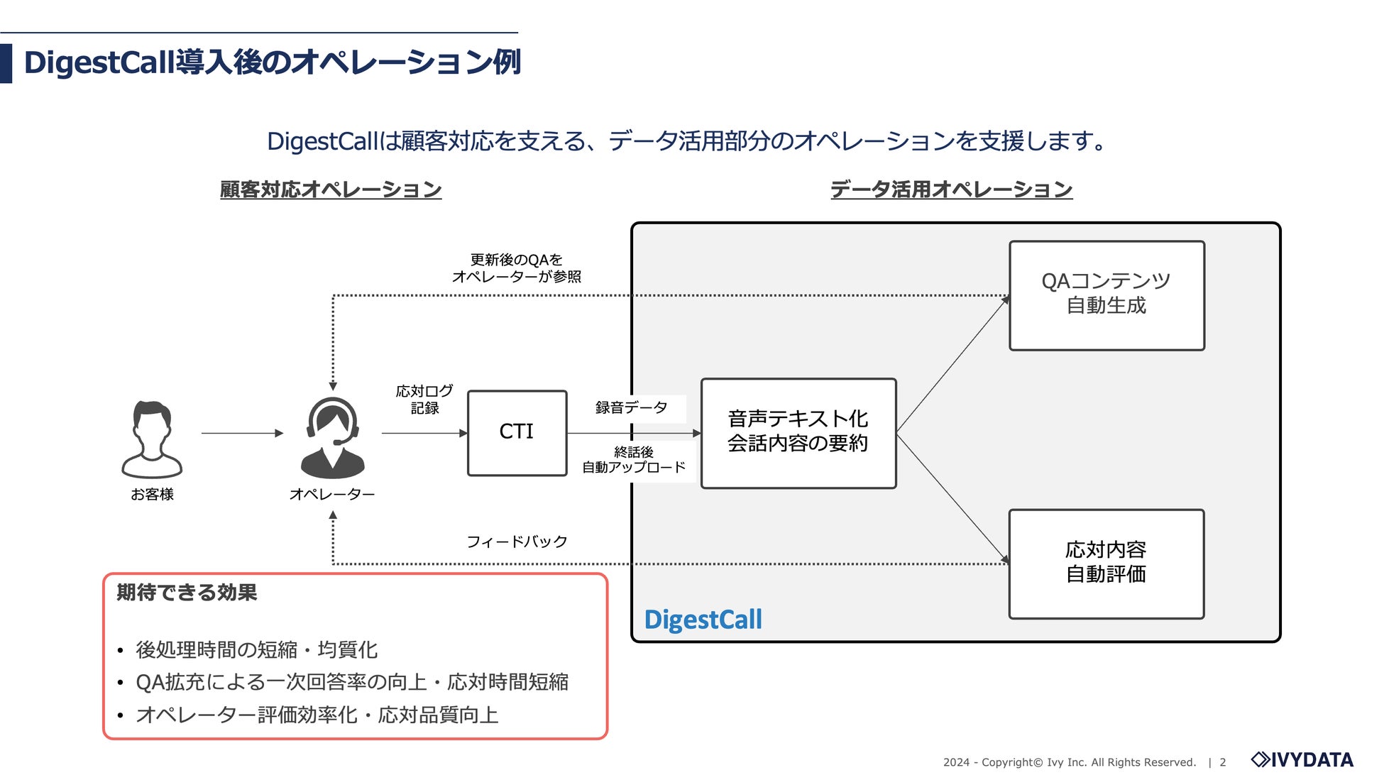 「DigestCall」は、後処理時間の短縮や、一次応答率向上を目的としてご活用いただいています。お客様からは次のようなお声をいただいておりました。