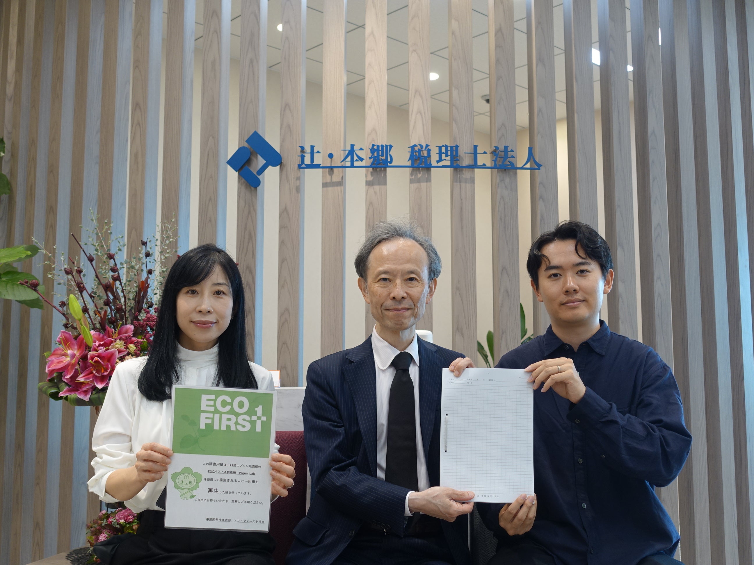 辻・本郷 税理士法人では、同じJR新宿ミライナタワーに本社を構える、エプソン販売株式会社と、2022年春より、不要となった使用済み用紙をエプソン販売本社にある乾式オフィス製紙機「PaperLab(ペーパーラボ)」で再生する取り組みを共同で行っている。使用済みの紙からほとんど水を使わずに新たな紙を⽣み出すPaperLabは、用紙の購入を減らすだけでなく、地球環境保全にも貢献している。