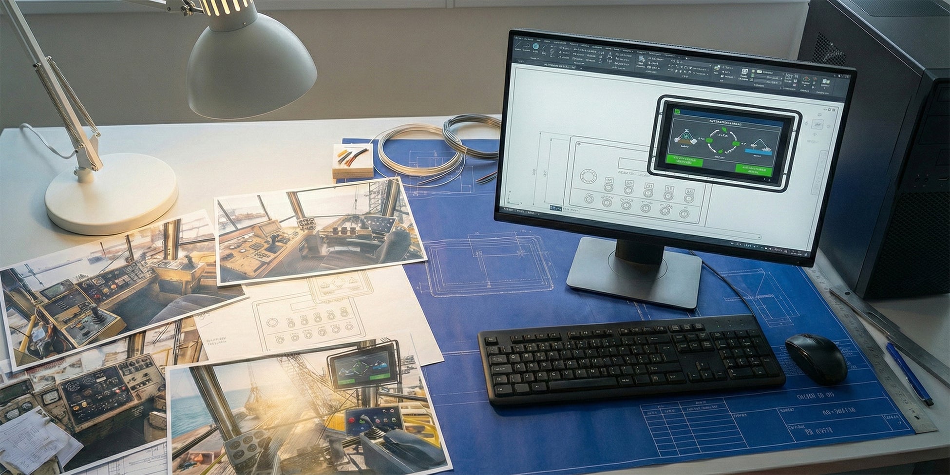 汎用遠隔操縦装置「XAURS」で培ったノウハウを活かし船室に合わせた遠隔操縦装置を設置、自動制御ソフトと連携することで既存グラブ浚渫船に自動施工機能を付与するシステムです。