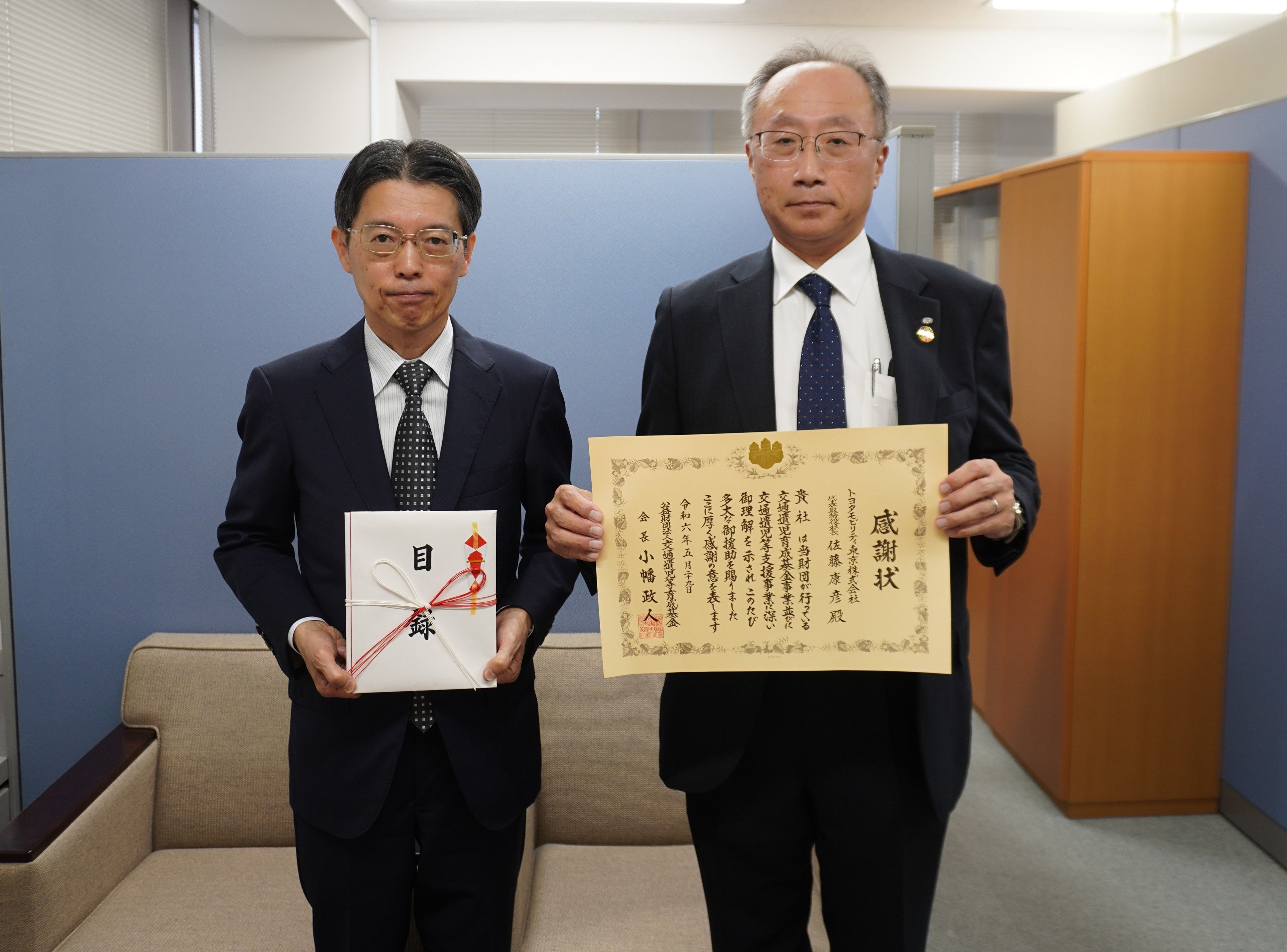 寄付式は交通遺児等育成基金の事務所にて執り行われ、当社から鎌野光治執行役員が、交通遺児等育
