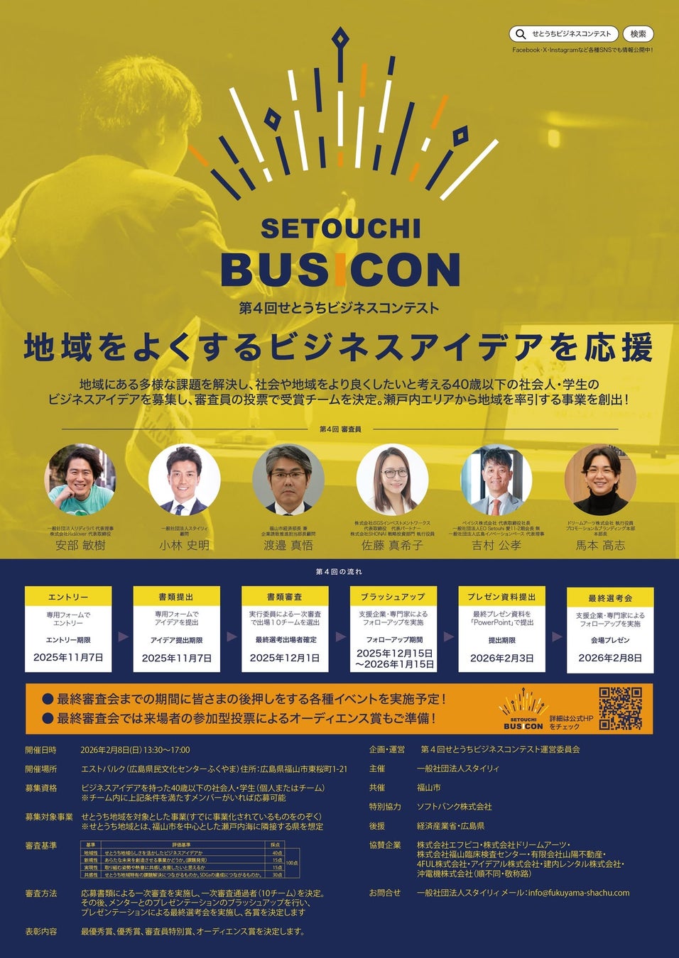 第4回せとうちビジネスコンテスト実行委員会(主催:一般社団法人スタイリィ)は、2026年2月8日(日)にエストパルク(広島県民文化センターふくやま)にて「第4回せとうちビジネスコンテスト」を開催いたします。全国から届いた36チームのエントリーから選ばれたファイナリスト10組が、瀬戸内地域の課題解決に挑むビジネスプランを発表します。今回のファイナリストは学生チームが中心。多文化共生、里山観光、不登校の子どもたちへの居場所づくりなど、若い視点から生まれた多彩なアイデアが揃いました。観覧は無料。当日は来場者投票による「オーディエンス賞」も実施し、投票いただいた方の中から抽選で10名様にオリジナルTシャツをプレゼントいたします。