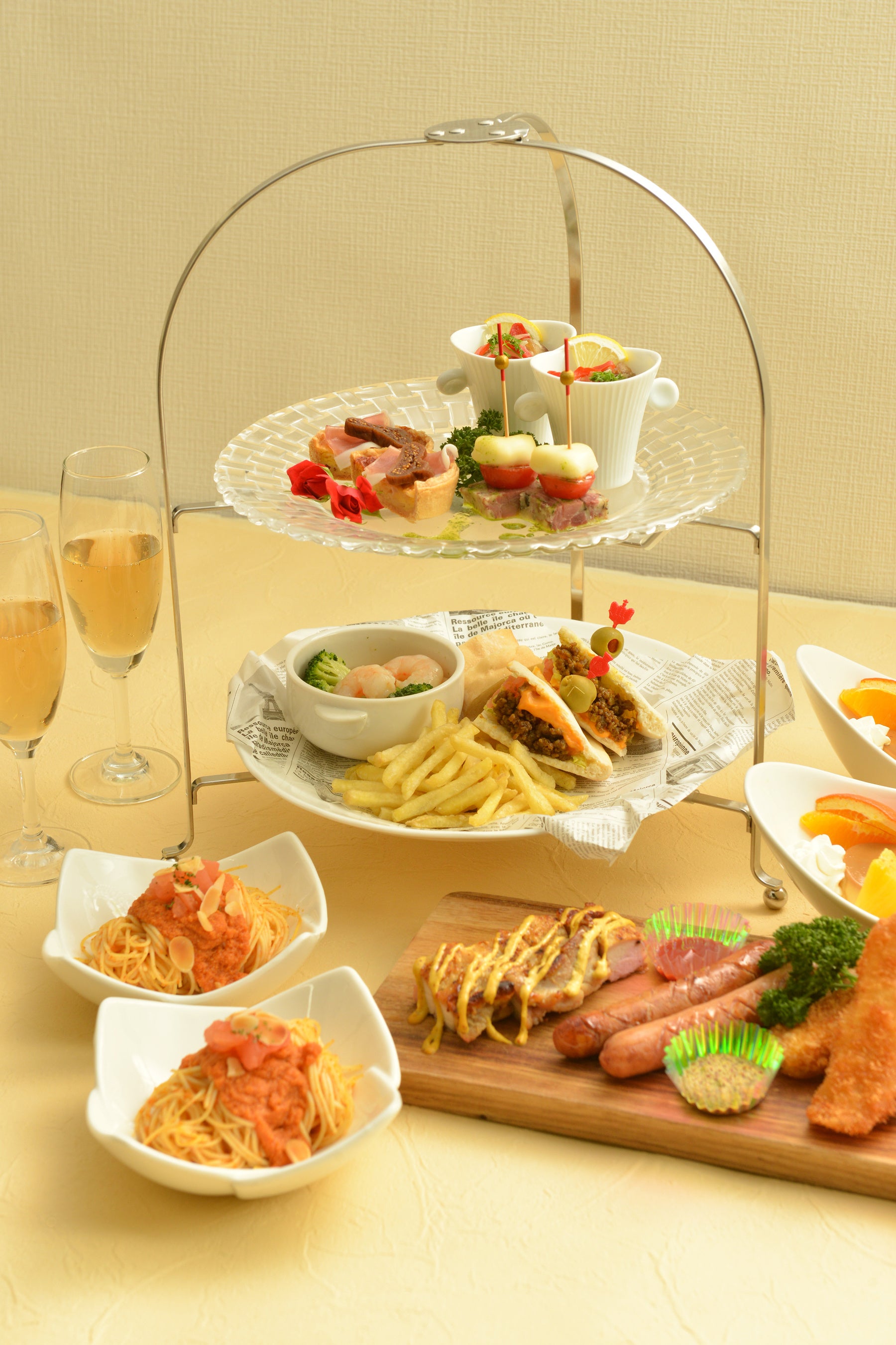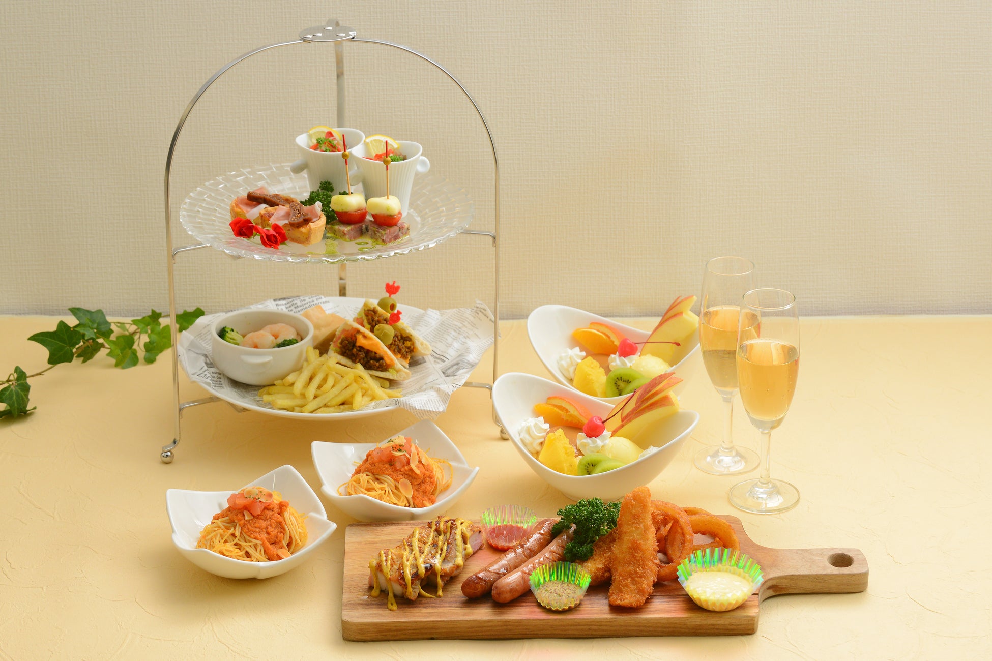 ①タルトキッシュ 生ハムと共に、②鯵のエスカベッシュ、③ハートモッツアレラとテリーヌのピンチョス、④タコス風サラダ、⑤海老とキノコのアヒージョ、⑥フィッシュ&ミートプレート、⑦ロメスコソースの冷製パスタ、⑧プリンアラモード