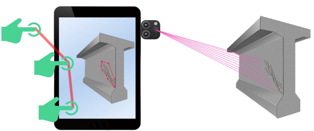 LiDARセンサーを用いた損傷寸法の計測が可能。またAIによる損傷判定機能も利用可能です。