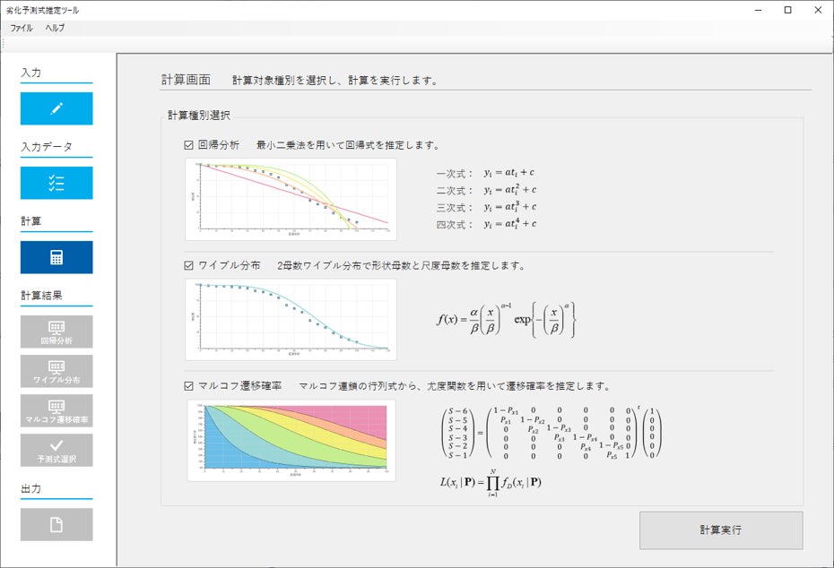 特定の施設や部材などの構造物に依存せず、複数の理論・手法を用いた劣化予測式を作成します。また、作成した劣化測式は容易に比較検討できるので、点検時の将来予測検討や個別施設計画策定など、各種業務を効率的に支援することが可能となります。