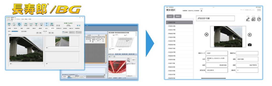 点検現場における作業を効率化できるタブレット版の現場支援アプリです。当社システム『長寿郎/BG』や『橋視郎』に登録された諸元や点検履歴など、点検時に必要なデータが連携でき、橋梁点検業務の飛躍的な効率化を実現します。