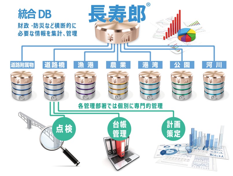 点検・診断業務の支援、台帳・各種履歴の整理・蓄積(データベース化)ができ、それらのデータを基に中長期の維持管理計画を策定します。