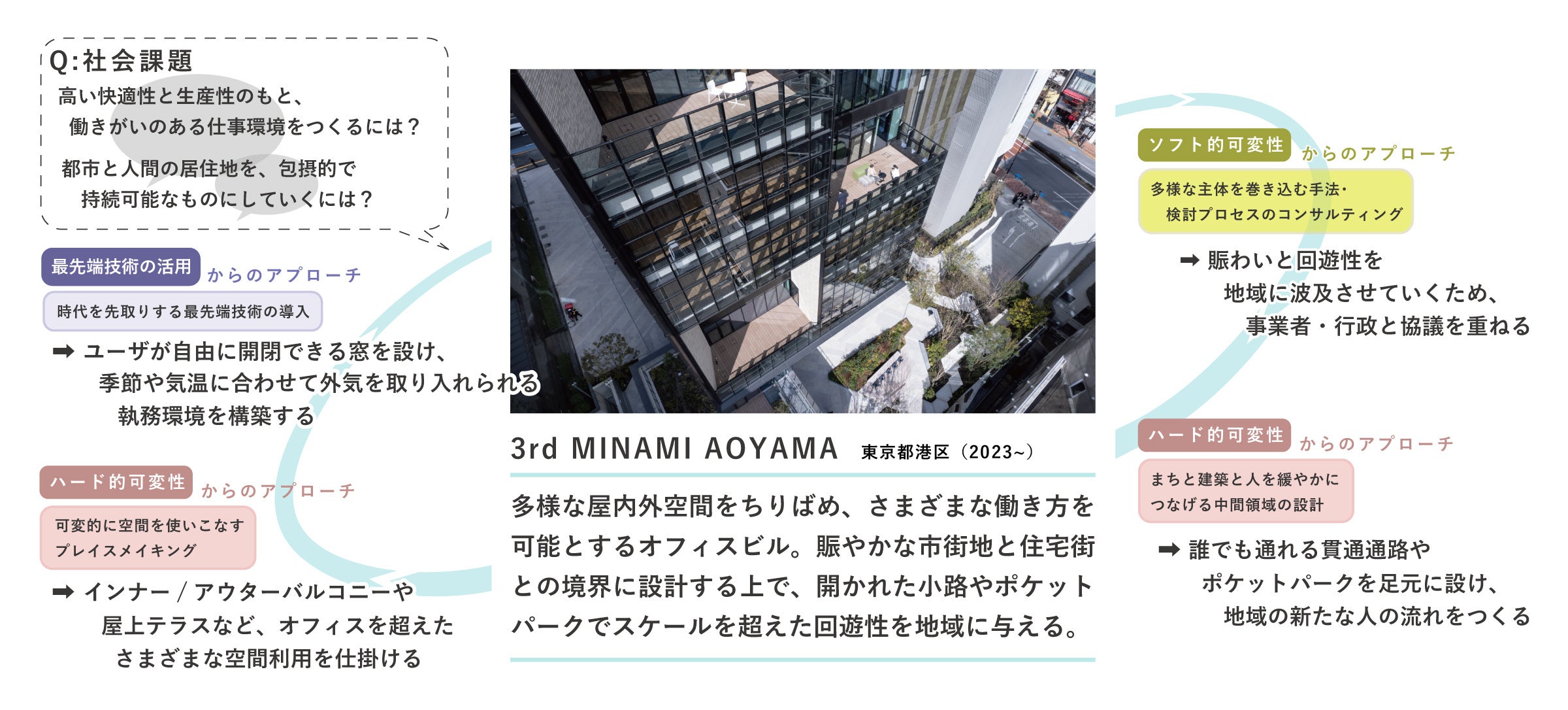 ▲ 上図では、「3rd MINAMI AOYAMA」(2023年竣工)を事例に、社会課題(左上)に対して、さまざまな計画のフェーズで、どのような「ホワイトインフラ思考」のアプローチを図っていったかを示しています。
