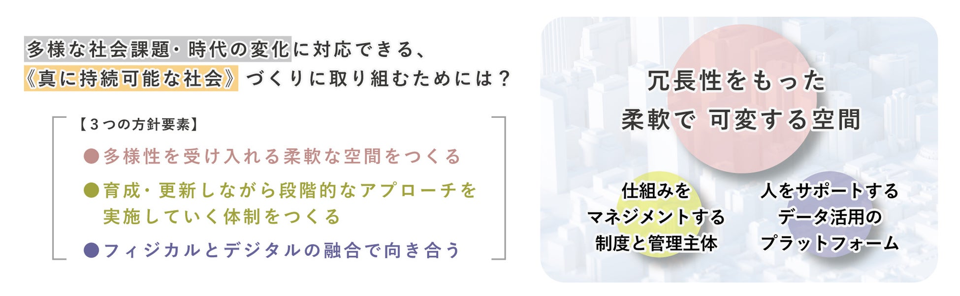 ▲ 社会課題・時代の変化へ対応できる、《真に持続可能な社会》の実現に取り組むための3つの要素。特に「冗長性を持った、柔軟で可変する空間」をハードとソフトの両面から構築し機能させる考え方が『ホワイトインフラ思考』です。
