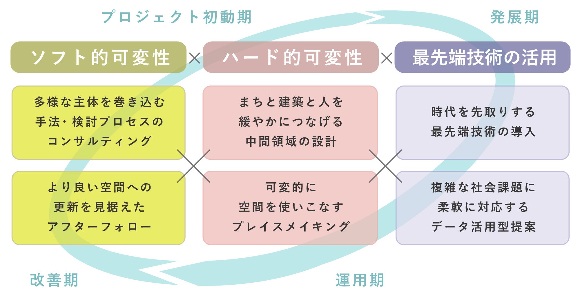 このアプローチにより、プロジェクトの初動期から、運用を経て、さらなる改善を考えるアフター期まで、さまざまなフェーズで柔軟性や可変性を都市や建築に組み込むことができます。社会全体のフレキシビリティを向上させる取り組みのサイクルです。
